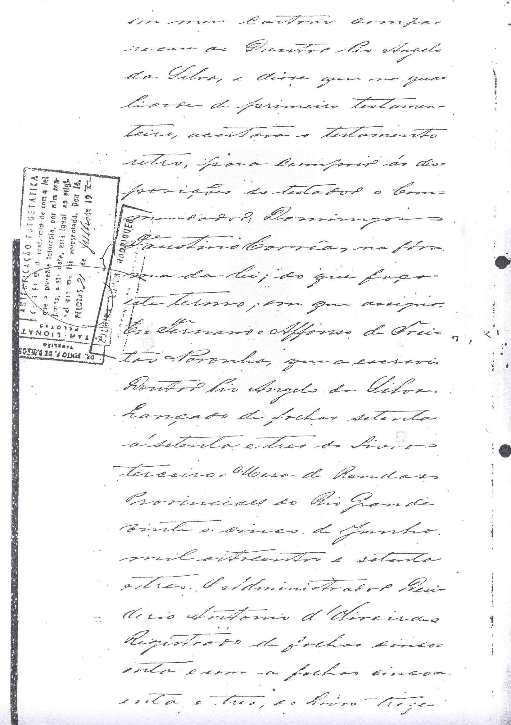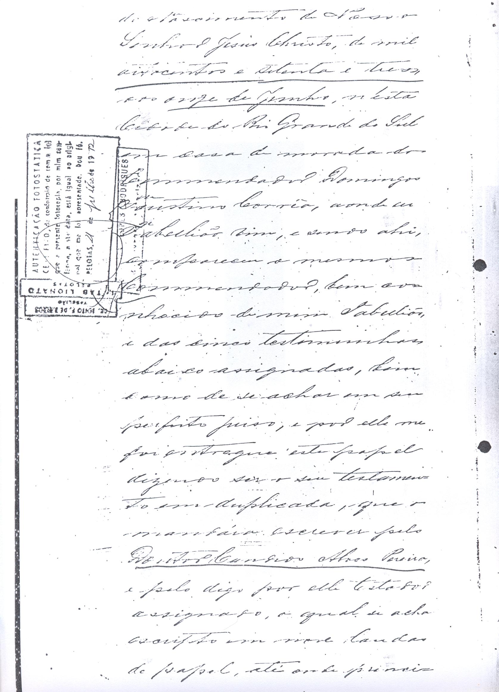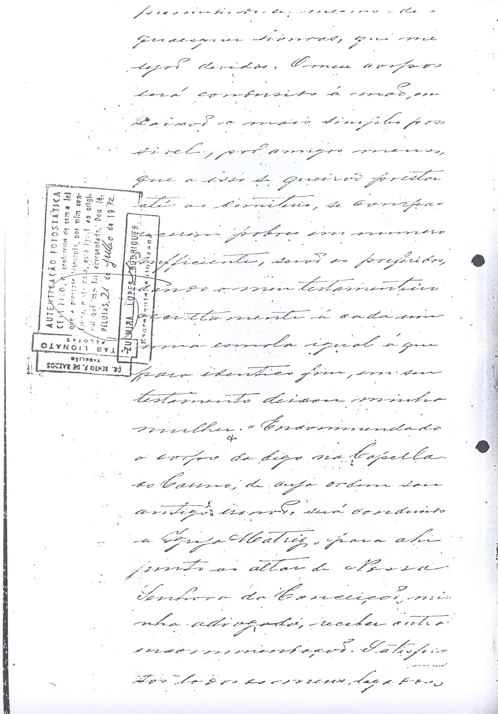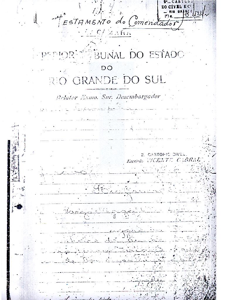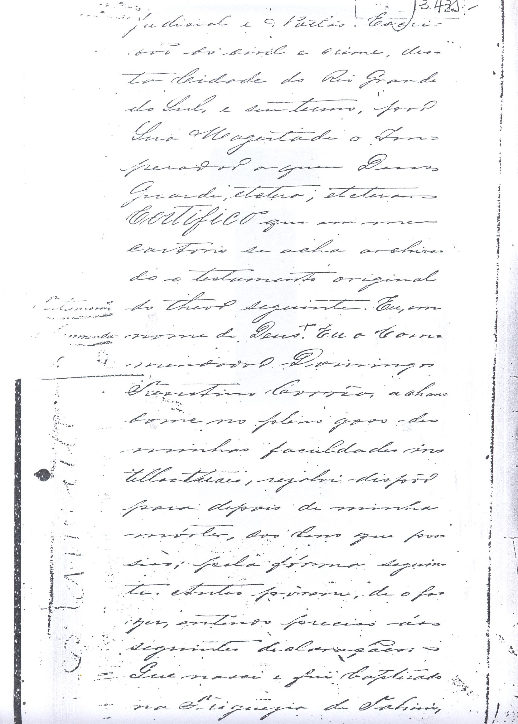 ....."Judicial e a Partes. Escrivão do cível e crime, desta Cidade do Rio Grande do Sul, e seu termo, por Sua Magestade o Imperador a quem Deus Guarde. etcetera, etectera. CERTIFICO que em meu cartório se acha archivado o testamento seguinte. Eu, e nome de Deus Amém, Eu o Comendador Domingos Faustino Corrêa, achando-me no pleno gozo das minhas faculdades intelectuaes, rezolvi dispôr para depois de minha mórte, dos bens que possuo, pela forma seguinte: Antes, pôrem, de o fazer, entendo preciso ás seguintes declarações: Que nasci e fui batizado na Freguezia do Thaim e sou filho legitimo do Senhor Faustino Corrêa e de sua Esposa Senhora Dona Izabel de Brum Corrêa, ambos fallecidos há muitos annos. Que fui casado em segundas nupceas com a Senhora Dona Leonor Maria Corrêa, fallecida, de cujo consorcio não tivemos filhos. Que no testamento que deixou minha mulher fui instituido herdeiro usufructuário dos bens de sua meação, e a propriedade dado em legado á seus irmãos Evaristo Corrêa Mirapalheta, Francisco Corrêa Mirapalheta e Joaquim Corrêa Mirapalheta, como herdeiros dos remanescentes. Que para o pagamento do imposto devido a Fazenda Provincial do uso-fructo da meação de minha mulher, fez a descripção dos bens do casal existentes no Municipio d'esta Cidade, como consta dos respectivos autos no Cartório do Escrivão Fernando Affonso de Freitas Noronha. Que os bens constantes dessa descripção, érão os existentes no tempo da morte de minha mulher, os outros bens que possuo são da minha exclusiva propriedade, havidos depois do fallecimento de minha mulher e todos elles conhecidos do meu testamenteiro e herdeiros. Declaro que na descripção que fiz dos bens do meu casal, não comprehendi os existentes no Estado Oriental, isto por duas razões: primeiro, porque o o usufructo delles não estava sujeito ao impôsto Provincial: segundo, por conselho de pessoas doutas, de me pertencerem elles exclusivamente, e nelles não ter minha mulher meação. Depois de minha mórte, meu testamenteiro satisfará todos os legados não cumpridos, constantes do testamento de minha mulher e entregará a seus herdeiros depois de uma legal divisão ou partilha, feita com citação delles e dos meus herdeiros, o que devidamente lhes vier a pertencer; e da execução do testamento, prestará contas no Juízo competente. Os bens que me pertencerem e ficarem no tempo de minha morte, distribua-os pela forma seguinte: DEIXO a liberdade todos os meus escravos com excepção da parda Antonia, que servirá como captiva à Dona Faustina Nunes até completar quarenta e cinco annos de idade, depois ela ficará forra. Meu testamenteiro dará sem demora cartas de liberdade, aos meus escravos forros. Querendo proteger e proporcionar meios de honesta subsistência, educação e futuro, às minhas crias e a seus descendentes de nomes João e Tito, filhos da parda Justa; Julieta, filha da parda Martha; Francisca e Deolinda, filhas da creoula Dorothéa Faustino e pardinhos Eduardo, Hilário e Adolpho, creoulinhos Francisco, filho da creoula Silvana; pardinhas Luisa, Marcellina, Amélia e Luiz, filhos da creoula Eva; deixo aos mesmos o usufructo por quatro gerações de meia légua de campo na lagoa Formósa, e uma légua para mais de campos nos Canudos, com todas as suas benfeitorias, aonde as mesmas crias tem de setecentos a oitocentos annimaes de crias. A administração dos legados as minhas crias confio a meu amigo Manoel Moreira Calçada e a Miguel Antonio Paz e rogo ao Doutor Juiz de Orphãos se digne nomeá-los conjuntamente tutores e administradores de minhas crias de menor idades e os tenho, para esse fim, como pessoas honestas e abonadas. O que produzir os campos legados e animaes, será dispendidos pelos administradores ou tutores na sustentação, vestuário, e educação e casamento das crias e seus descendentes, e com suas mães, enquanto se portarem bem, tratarem de seus filhos e se apllicarem ao trabalho. Si houver saldo será aplicado na compra de animaes, ou mettido em um Banco ou casa Bancária, a renderem benefício de minhas crias. Por morte ou maior idade de qualquer um dos beneficiados, continuará a administração até que acabe a quarta geração. Se alguma das minhas crias fallecer sem descendentes, a sua parte nos legados, pertencerá aos que sobreviverem. Declaro por último para evitar dúvidas futuras que a administração dos bens legados, durará até a extinção da quarta geração dos legatários, isto é, os bisnetos, quando cessará o usufructo do campo nos Canudos e se devolverá a meus herdeiros os seus legitimos sucessores e quando também a propriedade da meia légua de campo na lagoa Formosa passará livremente aos herdeiros dos bisnetos. Por morte de um dos administradores ficará o outro com toda a administração, e por morte ou falta de ambos, a escolha pertencerá ao Juiz de Orphãos com os mesmos encargos e condições. O Impôsto do uso-fructo será pago pelas forças de minha herança. Em attenção a amizade que sempre botei ao Senhor Doutor Pio Angelo da Silva ao desvelo com que me tem tratado, nas minhas enfermidades e a convicção em que estou de que saberá executar as minhas disposições, como meu primeiro testamenteiro, deixo-lhe (l.000) mil rezes de crias das existentes nos campos do Estado Oriental e arrendado pela sua vida, e depois de sua morte a seus filhos e netos em quanto viverem, quatro sortes de campo no Estado Oriental, pagando a meus herdeiros, por cada uma sorte, seiscentos mil réis por anno. Ao mesmo meu particular amigo dei em minha vida (16.000$000) dezesseis contos de réis para a compra de gado, a fim de povoar as quatro sortes de campo no Estado Oriental, cuja doação confirmo. DEIXO á viúva, filhas solteiras e uma viuva, do escrivão Luis Joaquim de Carvalho o usufructo, livre de direitos, por dous annos, contados do dia da minha morte, a casa que residem, de minha propriedade. A filha ou filhas do ex escrivão Carvalho,