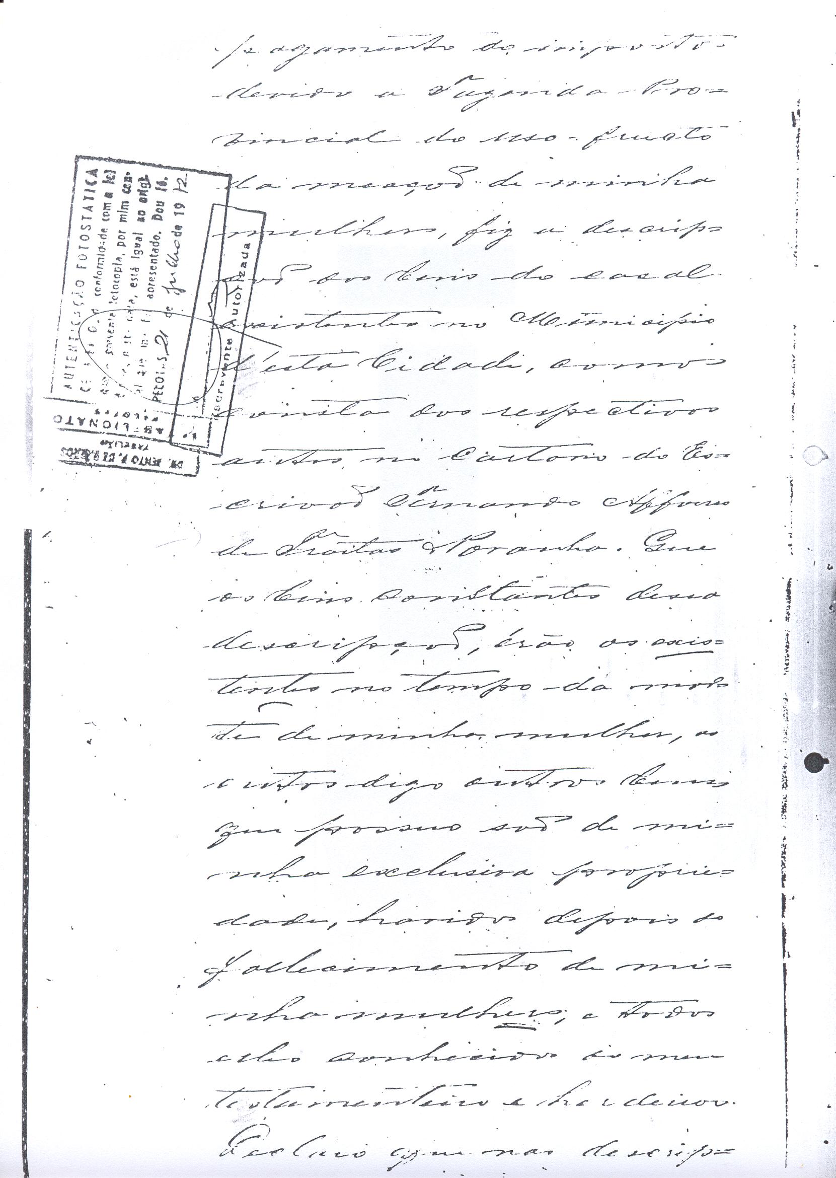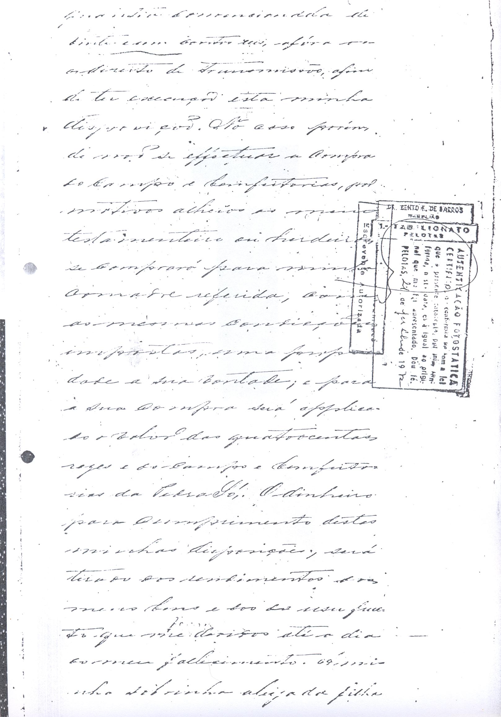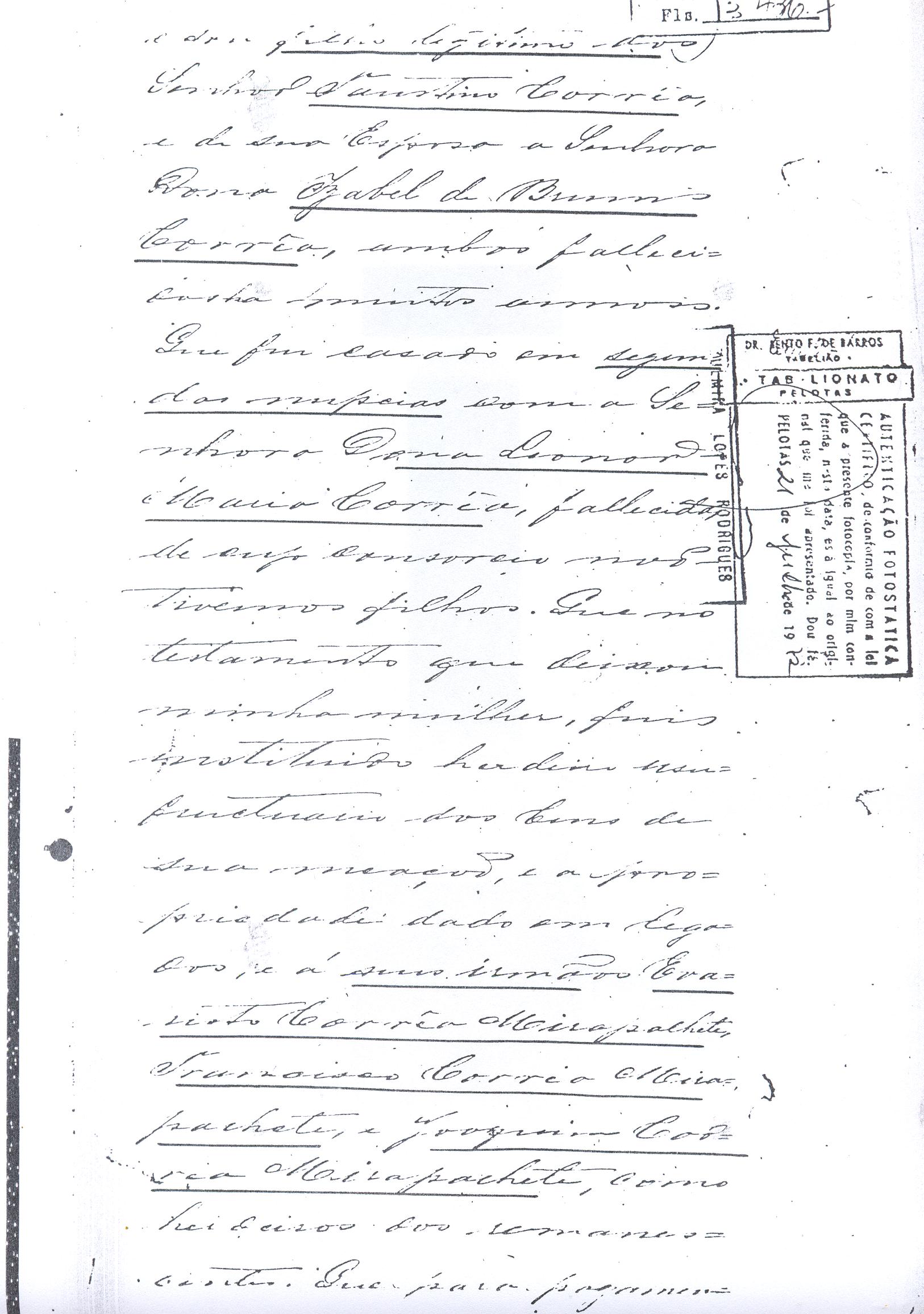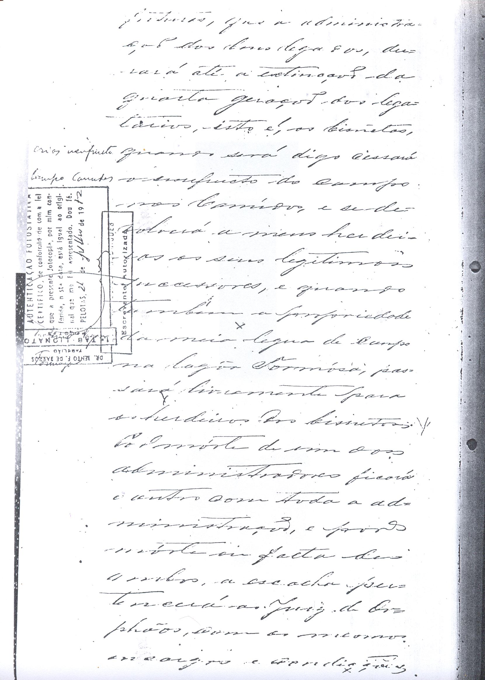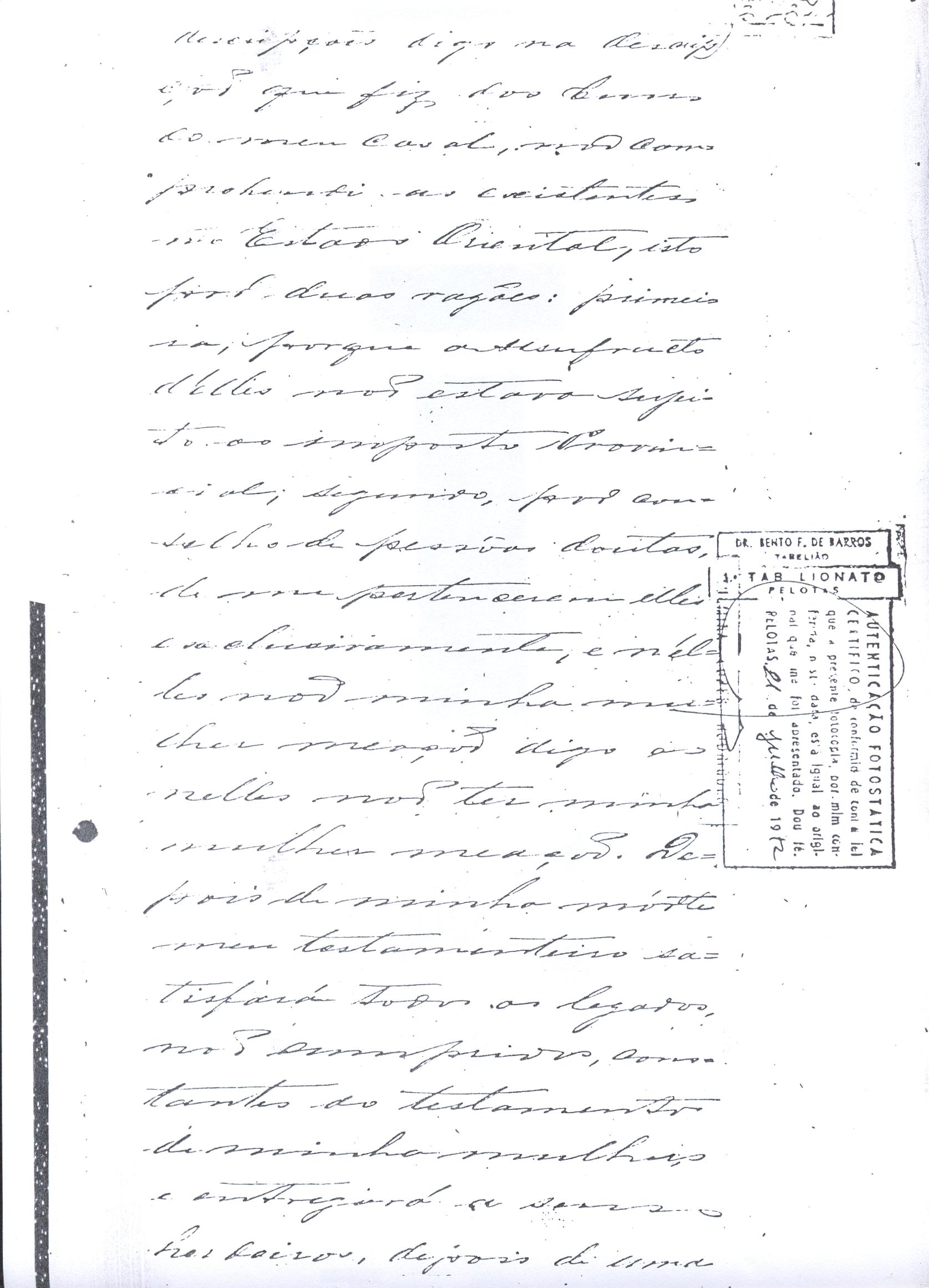 ....."Judicial e a Partes. Escrivão do cível e crime, desta Cidade do Rio Grande do Sul, e seu termo, por Sua Magestade o Imperador a quem Deus Guarde. etcetera, etectera. CERTIFICO que em meu cartório se acha archivado o testamento seguinte. Eu, e nome de Deus Amém, Eu o Comendador Domingos Faustino Corrêa, achando-me no pleno gozo das minhas faculdades intelectuaes, rezolvi dispôr para depois de minha mórte, dos bens que possuo, pela forma seguinte: Antes, pôrem, de o fazer, entendo preciso ás seguintes declarações: Que nasci e fui batizado na Freguezia do Thaim e sou filho legitimo do Senhor Faustino Corrêa e de sua Esposa Senhora Dona Izabel de Brum Corrêa, ambos fallecidos há muitos annos. Que fui casado em segundas nupceas com a Senhora Dona Leonor Maria Corrêa, fallecida, de cujo consorcio não tivemos filhos. Que no testamento que deixou minha mulher fui instituido herdeiro usufructuário dos bens de sua meação, e a propriedade dado em legado á seus irmãos Evaristo Corrêa Mirapalheta, Francisco Corrêa Mirapalheta e Joaquim Corrêa Mirapalheta, como herdeiros dos remanescentes. Que para o pagamento do imposto devido a Fazenda Provincial do uso-fructo da meação de minha mulher, fez a descripção dos bens do casal existentes no Municipio d'esta Cidade, como consta dos respectivos autos no Cartório do Escrivão Fernando Affonso de Freitas Noronha. Que os bens constantes dessa descripção, érão os existentes no tempo da morte de minha mulher, os outros bens que possuo são da minha exclusiva propriedade, havidos depois do fallecimento de minha mulher e todos elles conhecidos do meu testamenteiro e herdeiros. Declaro que na descripção que fiz dos bens do meu casal, não comprehendi os existentes no Estado Oriental, isto por duas razões: primeiro, porque o o usufructo delles não estava sujeito ao impôsto Provincial: segundo, por conselho de pessoas doutas, de me pertencerem elles exclusivamente, e nelles não ter minha mulher meação. Depois de minha mórte, meu testamenteiro satisfará todos os legados não cumpridos, constantes do testamento de minha mulher e entregará a seus herdeiros depois de uma legal divisão ou partilha, feita com citação delles e dos meus herdeiros, o que devidamente lhes vier a pertencer; e da execução do testamento, prestará contas no Juízo competente. Os bens que me pertencerem e ficarem no tempo de minha morte, distribua-os pela forma seguinte: DEIXO a liberdade todos os meus escravos com excepção da parda Antonia, que servirá como captiva à Dona Faustina Nunes até completar quarenta e cinco annos de idade, depois ela ficará forra. Meu testamenteiro dará sem demora cartas de liberdade, aos meus escravos forros. Querendo proteger e proporcionar meios de honesta subsistência, educação e futuro, às minhas crias e a seus descendentes de nomes João e Tito, filhos da parda Justa; Julieta, filha da parda Martha; Francisca e Deolinda, filhas da creoula Dorothéa Faustino e pardinhos Eduardo, Hilário e Adolpho, creoulinhos Francisco, filho da creoula Silvana; pardinhas Luisa, Marcellina, Amélia e Luiz, filhos da creoula Eva; deixo aos mesmos o usufructo por quatro gerações de meia légua de campo na lagoa Formósa, e uma légua para mais de campos nos Canudos, com todas as suas benfeitorias, aonde as mesmas crias tem de setecentos a oitocentos annimaes de crias. A administração dos legados as minhas crias confio a meu amigo Manoel Moreira Calçada e a Miguel Antonio Paz e rogo ao Doutor Juiz de Orphãos se digne nomeá-los conjuntamente tutores e administradores de minhas crias de menor idades e os tenho, para esse fim, como pessoas honestas e abonadas. O que produzir os campos legados e animaes, será dispendidos pelos administradores ou tutores na sustentação, vestuário, e educação e casamento das crias e seus descendentes, e com suas mães, enquanto se portarem bem, tratarem de seus filhos e se apllicarem ao trabalho. Si houver saldo será aplicado na compra de animaes, ou mettido em um Banco ou casa Bancária, a renderem benefício de minhas crias. Por morte ou maior idade de qualquer um dos beneficiados, continuará a administração até que acabe a quarta geração. Se alguma das minhas crias fallecer sem descendentes, a sua parte nos legados, pertencerá aos que sobreviverem. Declaro por último para evitar dúvidas futuras que a administração dos bens legados, durará até a extinção da quarta geração dos legatários, isto é, os bisnetos, quando cessará o usufructo do campo nos Canudos e se devolverá a meus herdeiros os seus legitimos sucessores e quando também a propriedade da meia légua de campo na lagoa Formosa passará livremente aos herdeiros dos bisnetos. Por morte de um dos administradores ficará o outro com toda a administração, e por morte ou falta de ambos, a escolha pertencerá ao Juiz de Orphãos com os mesmos encargos e condições. O Impôsto do uso-fructo será pago pelas forças de minha herança. Em attenção a amizade que sempre botei ao Senhor Doutor Pio Angelo da Silva ao desvelo com que me tem tratado, nas minhas enfermidades e a convicção em que estou de que saberá executar as minhas disposições, como meu primeiro testamenteiro, deixo-lhe (l.000) mil rezes de crias das existentes nos campos do Estado Oriental e arrendado pela sua vida, e depois de sua morte a seus filhos e netos em quanto viverem, quatro sortes de campo no Estado Oriental, pagando a meus herdeiros, por cada uma sorte, seiscentos mil réis por anno. Ao mesmo meu particular amigo dei em minha vida (16.000$000) dezesseis contos de réis para a compra de gado, a fim de povoar as quatro sortes de campo no Estado Oriental, cuja doação confirmo. DEIXO á viúva, filhas solteiras e uma viuva, do escrivão Luis Joaquim de Carvalho o usufructo, livre de direitos, por dous annos, contados do dia da minha morte, a casa que residem, de minha propriedade. A filha ou filhas do ex escrivão Carvalho,