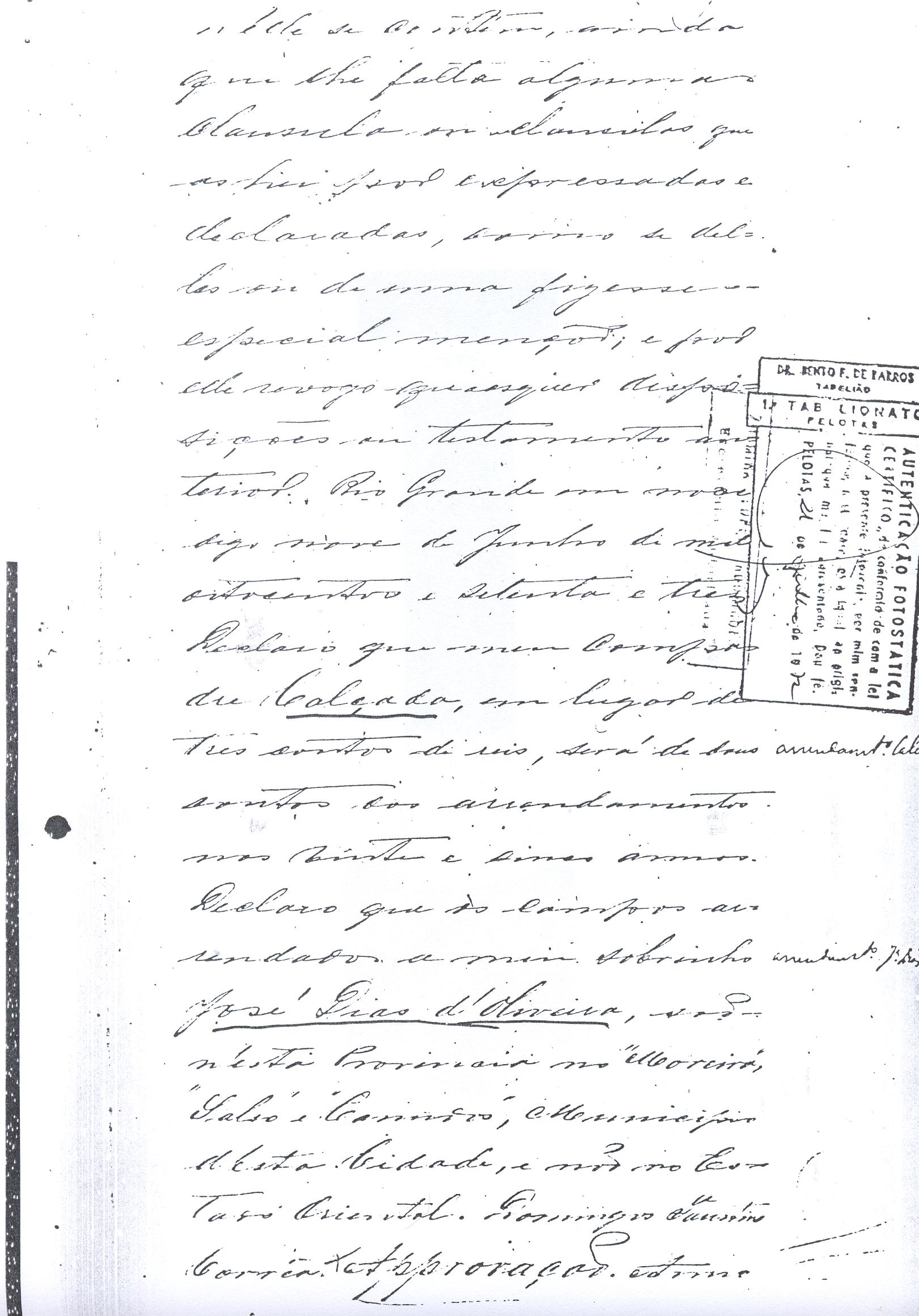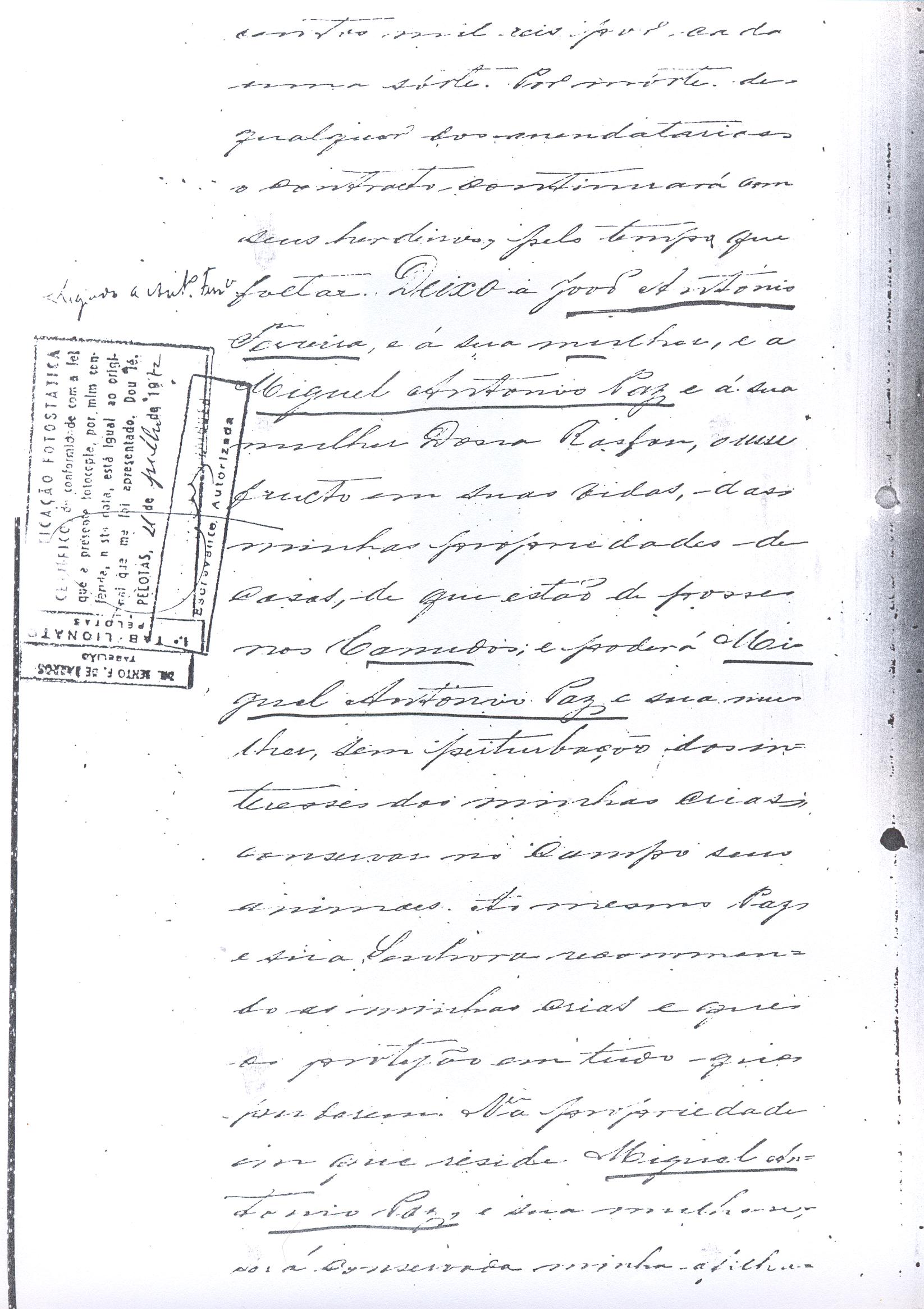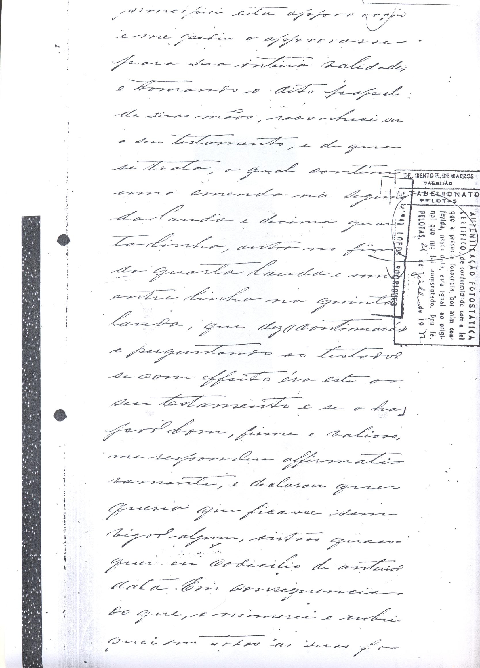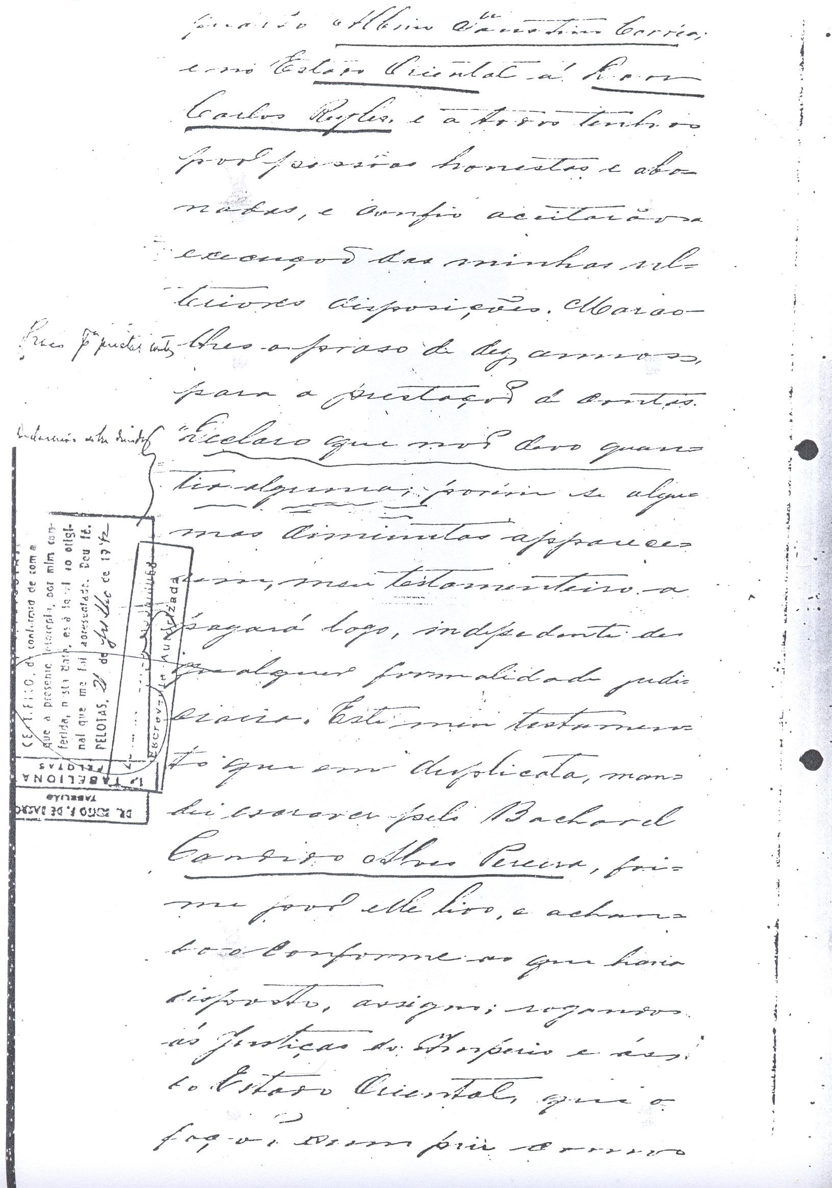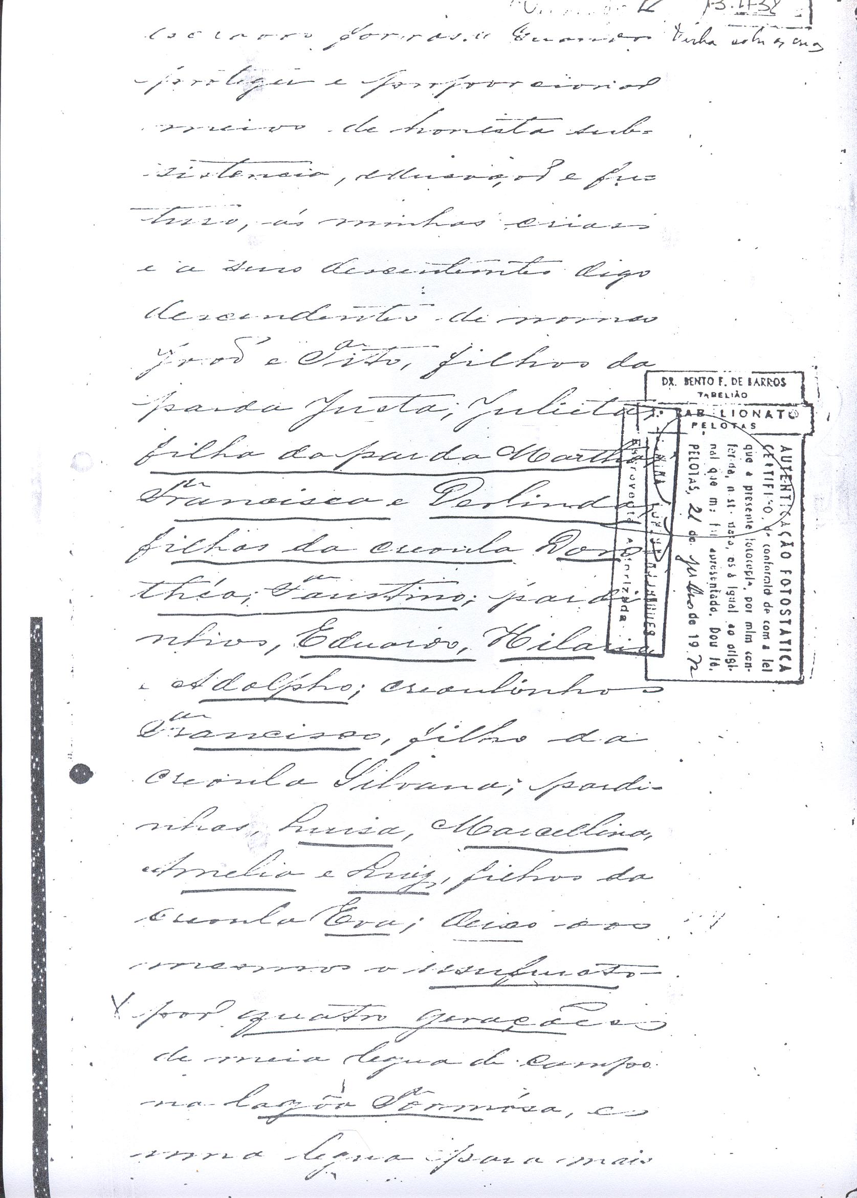 ....."Judicial e a Partes. Escrivão do cível e crime, desta Cidade do Rio Grande do Sul, e seu termo, por Sua Magestade o Imperador a quem Deus Guarde. etcetera, etectera. CERTIFICO que em meu cartório se acha archivado o testamento seguinte. Eu, e nome de Deus Amém, Eu o Comendador Domingos Faustino Corrêa, achando-me no pleno gozo das minhas faculdades intelectuaes, rezolvi dispôr para depois de minha mórte, dos bens que possuo, pela forma seguinte: Antes, pôrem, de o fazer, entendo preciso ás seguintes declarações: Que nasci e fui batizado na Freguezia do Thaim e sou filho legitimo do Senhor Faustino Corrêa e de sua Esposa Senhora Dona Izabel de Brum Corrêa, ambos fallecidos há muitos annos. Que fui casado em segundas nupceas com a Senhora Dona Leonor Maria Corrêa, fallecida, de cujo consorcio não tivemos filhos. Que no testamento que deixou minha mulher fui instituido herdeiro usufructuário dos bens de sua meação, e a propriedade dado em legado á seus irmãos Evaristo Corrêa Mirapalheta, Francisco Corrêa Mirapalheta e Joaquim Corrêa Mirapalheta, como herdeiros dos remanescentes. Que para o pagamento do imposto devido a Fazenda Provincial do uso-fructo da meação de minha mulher, fez a descripção dos bens do casal existentes no Municipio d'esta Cidade, como consta dos respectivos autos no Cartório do Escrivão Fernando Affonso de Freitas Noronha. Que os bens constantes dessa descripção, érão os existentes no tempo da morte de minha mulher, os outros bens que possuo são da minha exclusiva propriedade, havidos depois do fallecimento de minha mulher e todos elles conhecidos do meu testamenteiro e herdeiros. Declaro que na descripção que fiz dos bens do meu casal, não comprehendi os existentes no Estado Oriental, isto por duas razões: primeiro, porque o o usufructo delles não estava sujeito ao impôsto Provincial: segundo, por conselho de pessoas doutas, de me pertencerem elles exclusivamente, e nelles não ter minha mulher meação. Depois de minha mórte, meu testamenteiro satisfará todos os legados não cumpridos, constantes do testamento de minha mulher e entregará a seus herdeiros depois de uma legal divisão ou partilha, feita com citação delles e dos meus herdeiros, o que devidamente lhes vier a pertencer; e da execução do testamento, prestará contas no Juízo competente. Os bens que me pertencerem e ficarem no tempo de minha morte, distribua-os pela forma seguinte: DEIXO a liberdade todos os meus escravos com excepção da parda Antonia, que servirá como captiva à Dona Faustina Nunes até completar quarenta e cinco annos de idade, depois ela ficará forra. Meu testamenteiro dará sem demora cartas de liberdade, aos meus escravos forros. Querendo proteger e proporcionar meios de honesta subsistência, educação e futuro, às minhas crias e a seus descendentes de nomes João e Tito, filhos da parda Justa; Julieta, filha da parda Martha; Francisca e Deolinda, filhas da creoula Dorothéa Faustino e pardinhos Eduardo, Hilário e Adolpho, creoulinhos Francisco, filho da creoula Silvana; pardinhas Luisa, Marcellina, Amélia e Luiz, filhos da creoula Eva; deixo aos mesmos o usufructo por quatro gerações de meia légua de campo na lagoa Formósa, e uma légua para mais de campos nos Canudos, com todas as suas benfeitorias, aonde as mesmas crias tem de setecentos a oitocentos annimaes de crias. A administração dos legados as minhas crias confio a meu amigo Manoel Moreira Calçada e a Miguel Antonio Paz e rogo ao Doutor Juiz de Orphãos se digne nomeá-los conjuntamente tutores e administradores de minhas crias de menor idades e os tenho, para esse fim, como pessoas honestas e abonadas. O que produzir os campos legados e animaes, será dispendidos pelos administradores ou tutores na sustentação, vestuário, e educação e casamento das crias e seus descendentes, e com suas mães, enquanto se portarem bem, tratarem de seus filhos e se apllicarem ao trabalho. Si houver saldo será aplicado na compra de animaes, ou mettido em um Banco ou casa Bancária, a renderem benefício de minhas crias. Por morte ou maior idade de qualquer um dos beneficiados, continuará a administração até que acabe a quarta geração. Se alguma das minhas crias fallecer sem descendentes, a sua parte nos legados, pertencerá aos que sobreviverem. Declaro por último para evitar dúvidas futuras que a administração dos bens legados, durará até a extinção da quarta geração dos legatários, isto é, os bisnetos, quando cessará o usufructo do campo nos Canudos e se devolverá a meus herdeiros os seus legitimos sucessores e quando também a propriedade da meia légua de campo na lagoa Formosa passará livremente aos herdeiros dos bisnetos. Por morte de um dos administradores ficará o outro com toda a administração, e por morte ou falta de ambos, a escolha pertencerá ao Juiz de Orphãos com os mesmos encargos e condições. O Impôsto do uso-fructo será pago pelas forças de minha herança. Em attenção a amizade que sempre botei ao Senhor Doutor Pio Angelo da Silva ao desvelo com que me tem tratado, nas minhas enfermidades e a convicção em que estou de que saberá executar as minhas disposições, como meu primeiro testamenteiro, deixo-lhe (l.000) mil rezes de crias das existentes nos campos do Estado Oriental e arrendado pela sua vida, e depois de sua morte a seus filhos e netos em quanto viverem, quatro sortes de campo no Estado Oriental, pagando a meus herdeiros, por cada uma sorte, seiscentos mil réis por anno. Ao mesmo meu particular amigo dei em minha vida (16.000$000) dezesseis contos de réis para a compra de gado, a fim de povoar as quatro sortes de campo no Estado Oriental, cuja doação confirmo. DEIXO á viúva, filhas solteiras e uma viuva, do escrivão Luis Joaquim de Carvalho o usufructo, livre de direitos, por dous annos, contados do dia da minha morte, a casa que residem, de minha propriedade. A filha ou filhas do ex escrivão Carvalho,