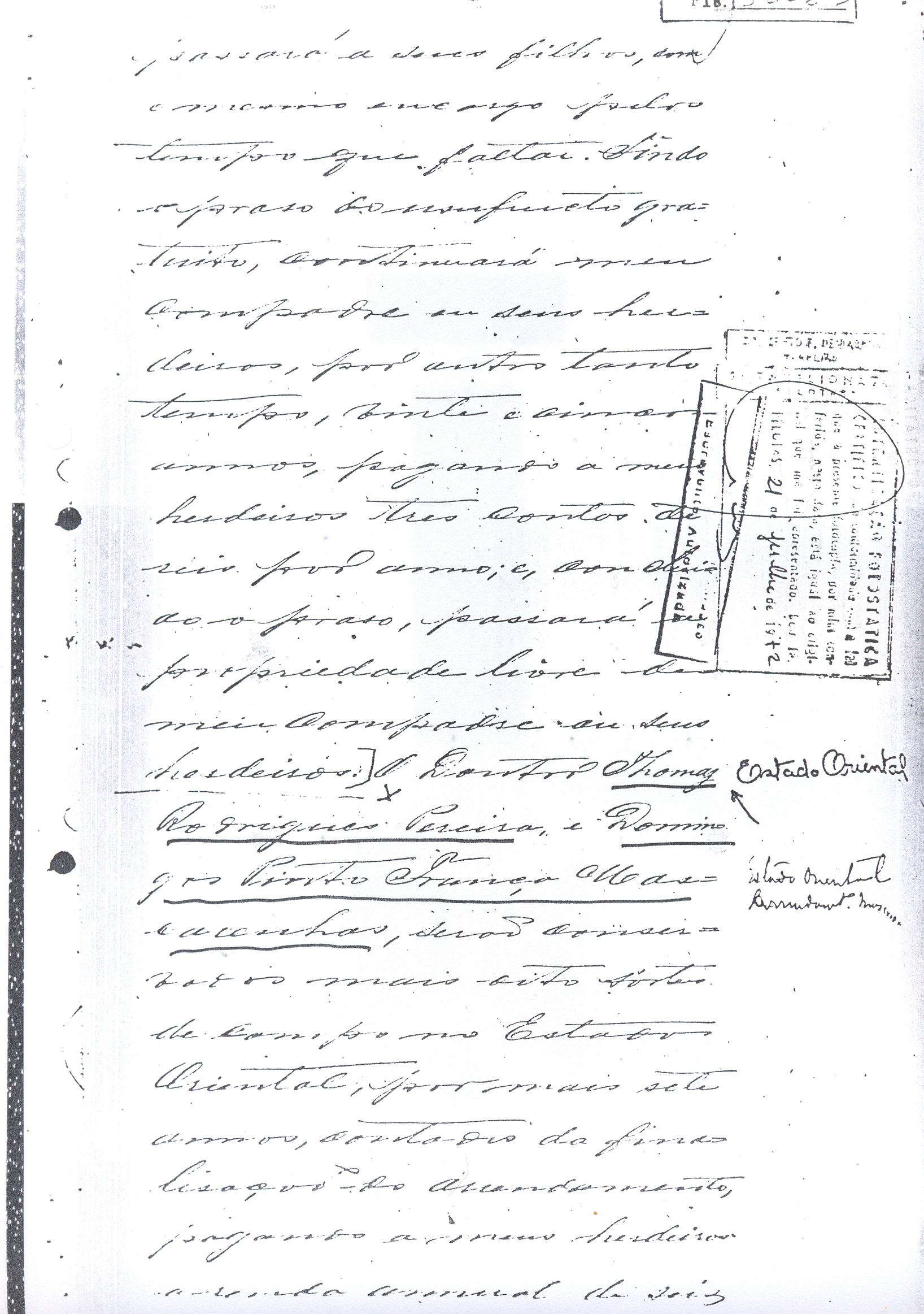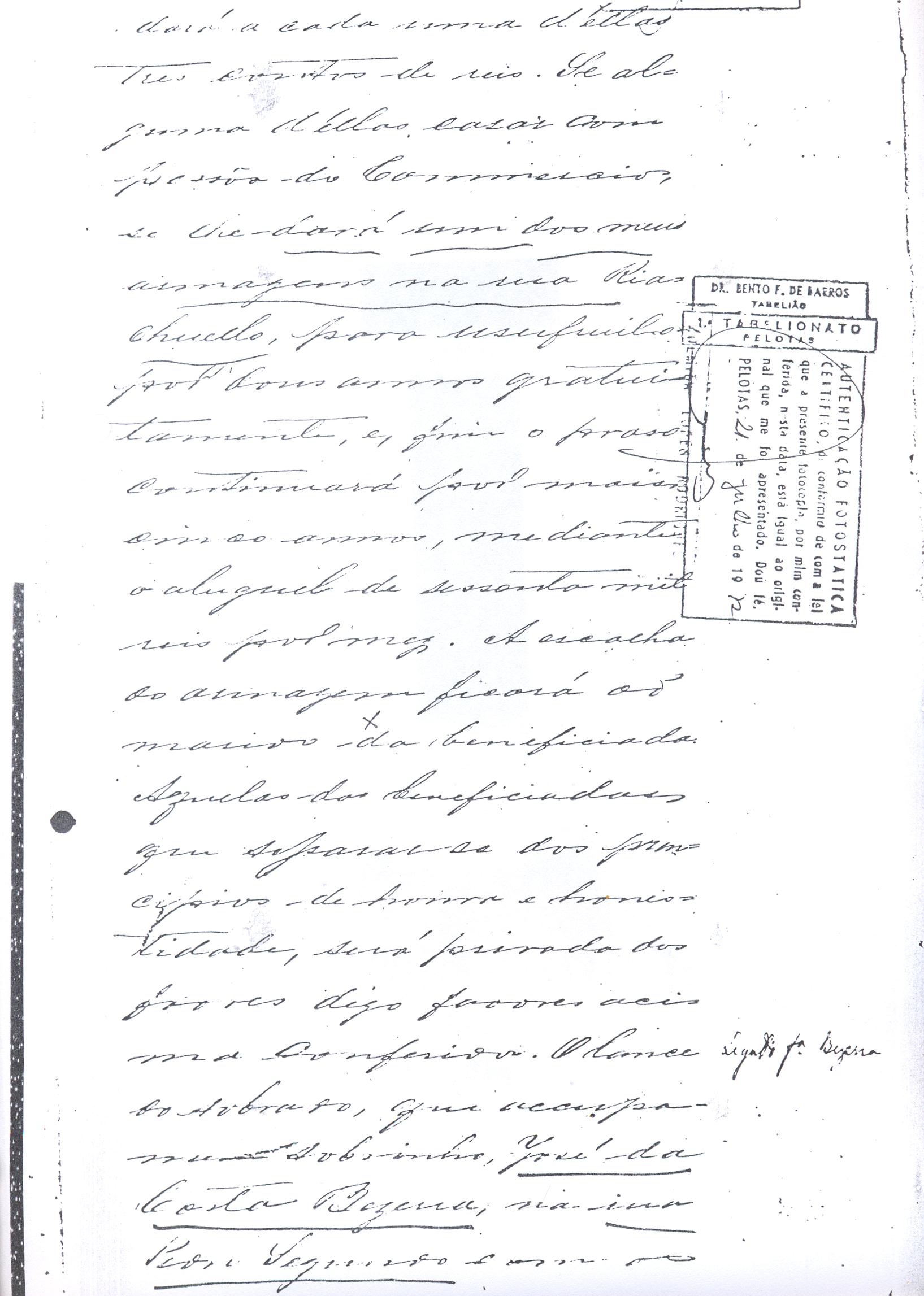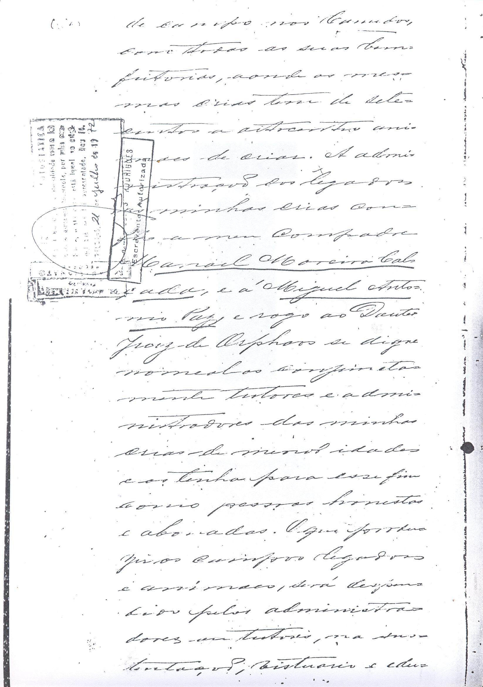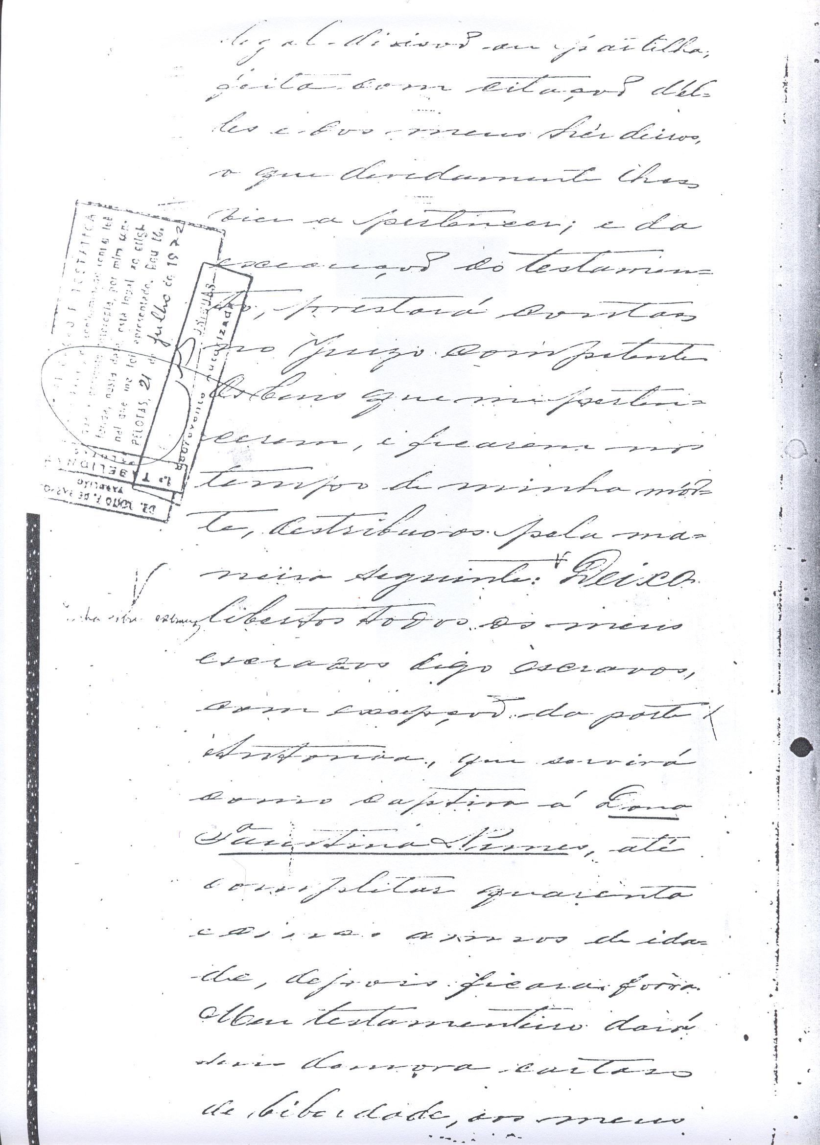 ....."Judicial e a Partes. Escrivão do cível e crime, desta Cidade do Rio Grande do Sul, e seu termo, por Sua Magestade o Imperador a quem Deus Guarde. etcetera, etectera. CERTIFICO que em meu cartório se acha archivado o testamento seguinte. Eu, e nome de Deus Amém, Eu o Comendador Domingos Faustino Corrêa, achando-me no pleno gozo das minhas faculdades intelectuaes, rezolvi dispôr para depois de minha mórte, dos bens que possuo, pela forma seguinte: Antes, pôrem, de o fazer, entendo preciso ás seguintes declarações: Que nasci e fui batizado na Freguezia do Thaim e sou filho legitimo do Senhor Faustino Corrêa e de sua Esposa Senhora Dona Izabel de Brum Corrêa, ambos fallecidos há muitos annos. Que fui casado em segundas nupceas com a Senhora Dona Leonor Maria Corrêa, fallecida, de cujo consorcio não tivemos filhos. Que no testamento que deixou minha mulher fui instituido herdeiro usufructuário dos bens de sua meação, e a propriedade dado em legado á seus irmãos Evaristo Corrêa Mirapalheta, Francisco Corrêa Mirapalheta e Joaquim Corrêa Mirapalheta, como herdeiros dos remanescentes. Que para o pagamento do imposto devido a Fazenda Provincial do uso-fructo da meação de minha mulher, fez a descripção dos bens do casal existentes no Municipio d'esta Cidade, como consta dos respectivos autos no Cartório do Escrivão Fernando Affonso de Freitas Noronha. Que os bens constantes dessa descripção, érão os existentes no tempo da morte de minha mulher, os outros bens que possuo são da minha exclusiva propriedade, havidos depois do fallecimento de minha mulher e todos elles conhecidos do meu testamenteiro e herdeiros. Declaro que na descripção que fiz dos bens do meu casal, não comprehendi os existentes no Estado Oriental, isto por duas razões: primeiro, porque o o usufructo delles não estava sujeito ao impôsto Provincial: segundo, por conselho de pessoas doutas, de me pertencerem elles exclusivamente, e nelles não ter minha mulher meação. Depois de minha mórte, meu testamenteiro satisfará todos os legados não cumpridos, constantes do testamento de minha mulher e entregará a seus herdeiros depois de uma legal divisão ou partilha, feita com citação delles e dos meus herdeiros, o que devidamente lhes vier a pertencer; e da execução do testamento, prestará contas no Juízo competente. Os bens que me pertencerem e ficarem no tempo de minha morte, distribua-os pela forma seguinte: DEIXO a liberdade todos os meus escravos com excepção da parda Antonia, que servirá como captiva à Dona Faustina Nunes até completar quarenta e cinco annos de idade, depois ela ficará forra. Meu testamenteiro dará sem demora cartas de liberdade, aos meus escravos forros. Querendo proteger e proporcionar meios de honesta subsistência, educação e futuro, às minhas crias e a seus descendentes de nomes João e Tito, filhos da parda Justa; Julieta, filha da parda Martha; Francisca e Deolinda, filhas da creoula Dorothéa Faustino e pardinhos Eduardo, Hilário e Adolpho, creoulinhos Francisco, filho da creoula Silvana; pardinhas Luisa, Marcellina, Amélia e Luiz, filhos da creoula Eva; deixo aos mesmos o usufructo por quatro gerações de meia légua de campo na lagoa Formósa, e uma légua para mais de campos nos Canudos, com todas as suas benfeitorias, aonde as mesmas crias tem de setecentos a oitocentos annimaes de crias. A administração dos legados as minhas crias confio a meu amigo Manoel Moreira Calçada e a Miguel Antonio Paz e rogo ao Doutor Juiz de Orphãos se digne nomeá-los conjuntamente tutores e administradores de minhas crias de menor idades e os tenho, para esse fim, como pessoas honestas e abonadas. O que produzir os campos legados e animaes, será dispendidos pelos administradores ou tutores na sustentação, vestuário, e educação e casamento das crias e seus descendentes, e com suas mães, enquanto se portarem bem, tratarem de seus filhos e se apllicarem ao trabalho. Si houver saldo será aplicado na compra de animaes, ou mettido em um Banco ou casa Bancária, a renderem benefício de minhas crias. Por morte ou maior idade de qualquer um dos beneficiados, continuará a administração até que acabe a quarta geração. Se alguma das minhas crias fallecer sem descendentes, a sua parte nos legados, pertencerá aos que sobreviverem. Declaro por último para evitar dúvidas futuras que a administração dos bens legados, durará até a extinção da quarta geração dos legatários, isto é, os bisnetos, quando cessará o usufructo do campo nos Canudos e se devolverá a meus herdeiros os seus legitimos sucessores e quando também a propriedade da meia légua de campo na lagoa Formosa passará livremente aos herdeiros dos bisnetos. Por morte de um dos administradores ficará o outro com toda a administração, e por morte ou falta de ambos, a escolha pertencerá ao Juiz de Orphãos com os mesmos encargos e condições. O Impôsto do uso-fructo será pago pelas forças de minha herança. Em attenção a amizade que sempre botei ao Senhor Doutor Pio Angelo da Silva ao desvelo com que me tem tratado, nas minhas enfermidades e a convicção em que estou de que saberá executar as minhas disposições, como meu primeiro testamenteiro, deixo-lhe (l.000) mil rezes de crias das existentes nos campos do Estado Oriental e arrendado pela sua vida, e depois de sua morte a seus filhos e netos em quanto viverem, quatro sortes de campo no Estado Oriental, pagando a meus herdeiros, por cada uma sorte, seiscentos mil réis por anno. Ao mesmo meu particular amigo dei em minha vida (16.000$000) dezesseis contos de réis para a compra de gado, a fim de povoar as quatro sortes de campo no Estado Oriental, cuja doação confirmo. DEIXO á viúva, filhas solteiras e uma viuva, do escrivão Luis Joaquim de Carvalho o usufructo, livre de direitos, por dous annos, contados do dia da minha morte, a casa que residem, de minha propriedade. A filha ou filhas do ex escrivão Carvalho,