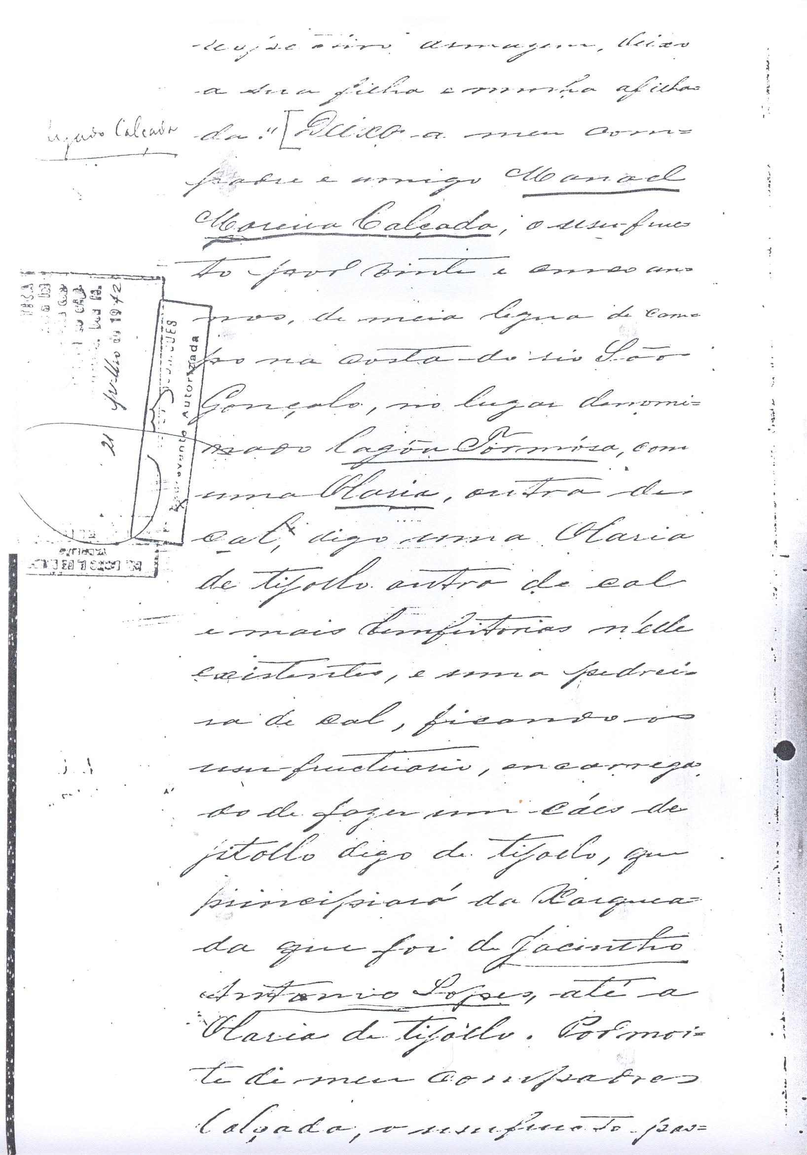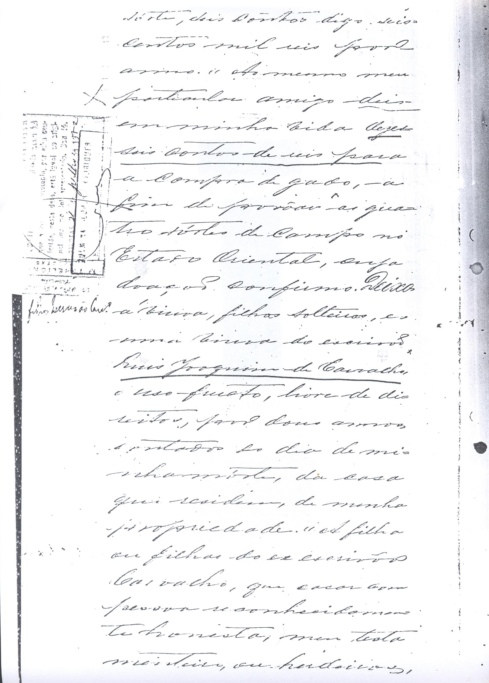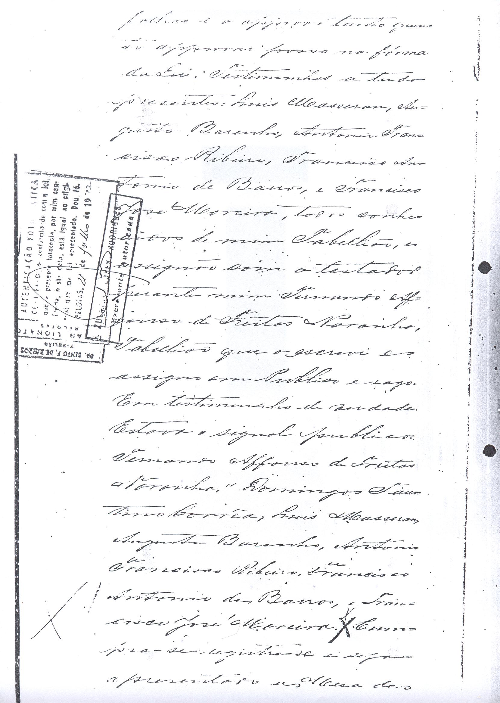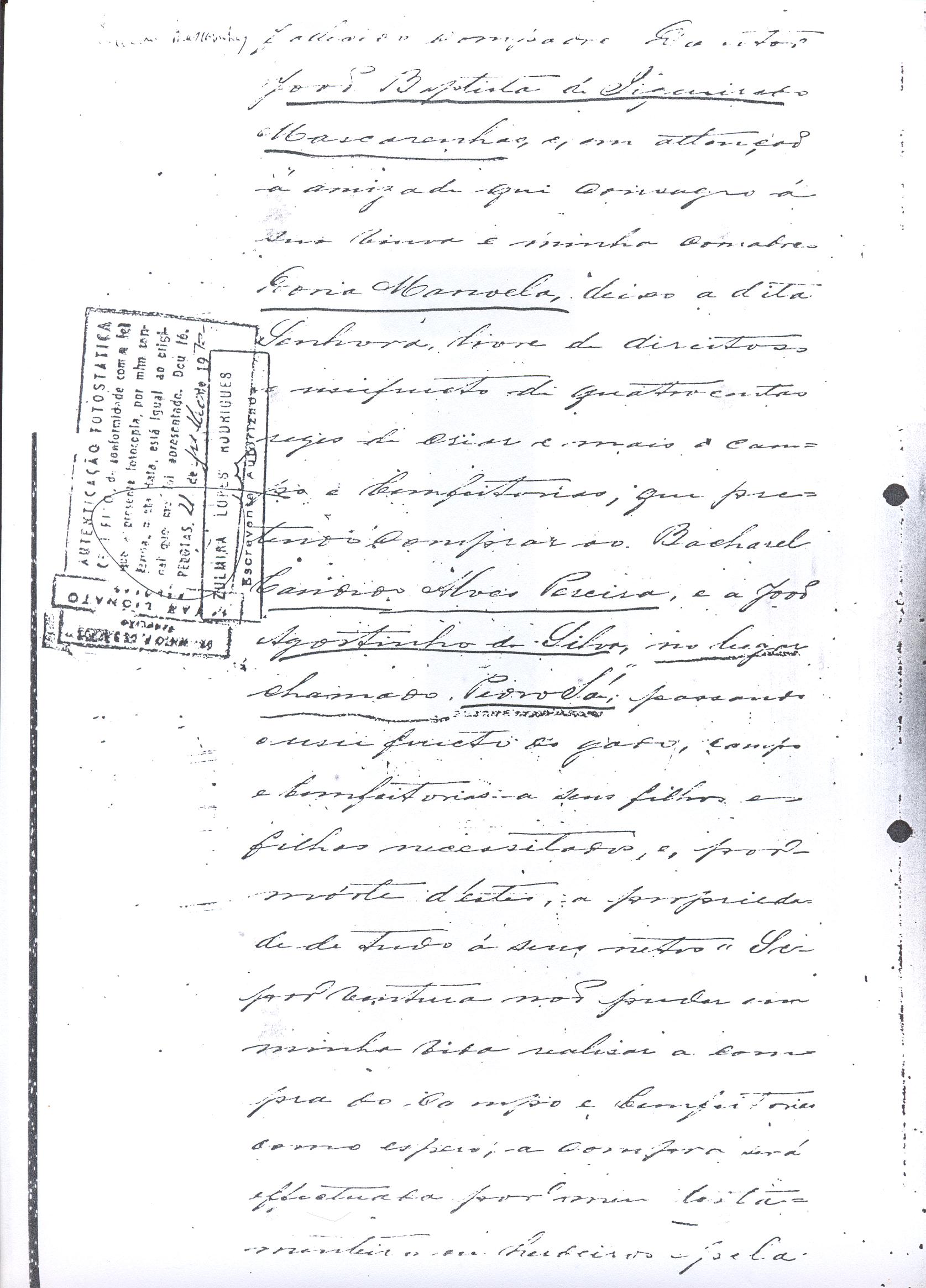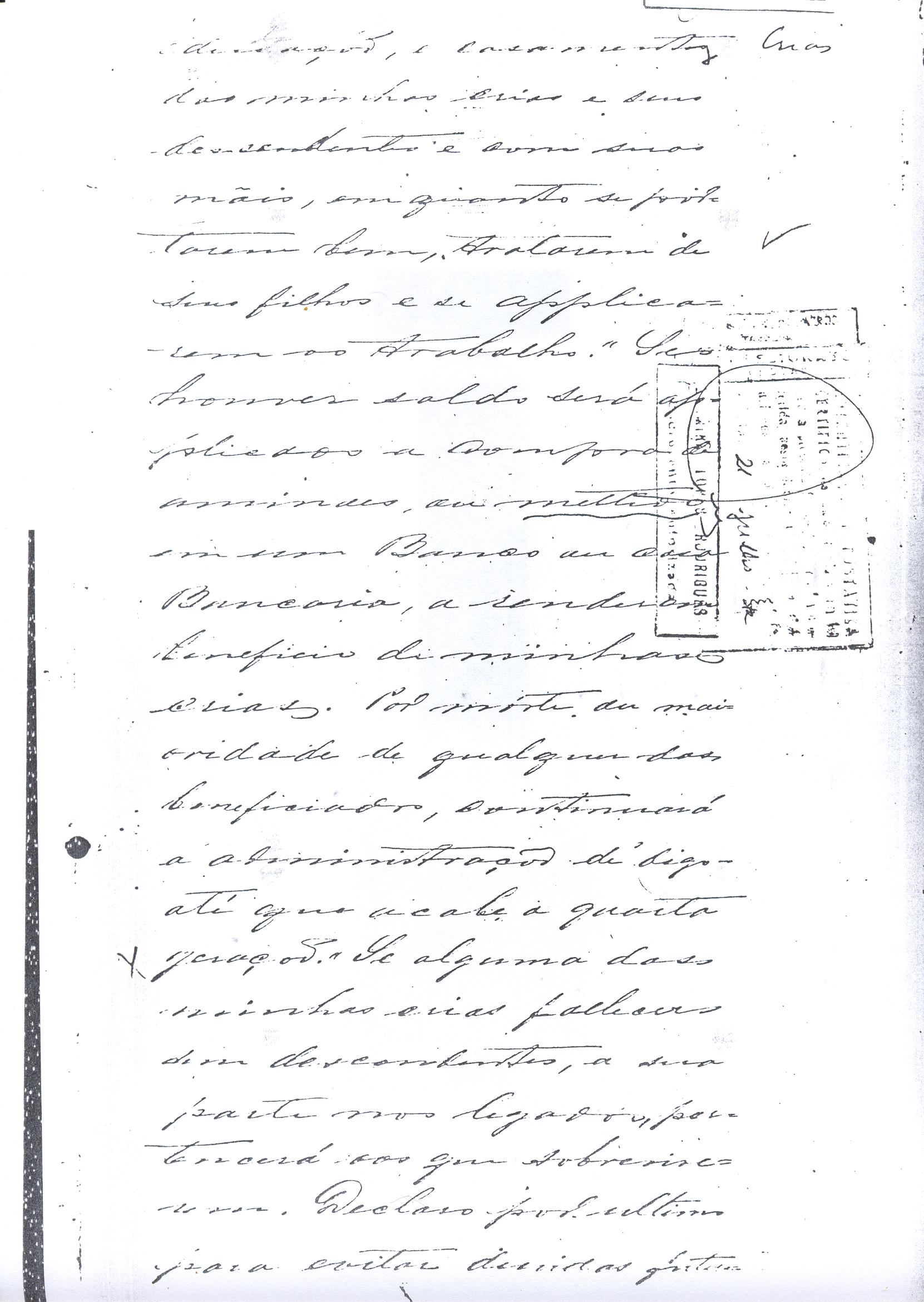 ....."Judicial e a Partes. Escrivão do cível e crime, desta Cidade do Rio Grande do Sul, e seu termo, por Sua Magestade o Imperador a quem Deus Guarde. etcetera, etectera. CERTIFICO que em meu cartório se acha archivado o testamento seguinte. Eu, e nome de Deus Amém, Eu o Comendador Domingos Faustino Corrêa, achando-me no pleno gozo das minhas faculdades intelectuaes, rezolvi dispôr para depois de minha mórte, dos bens que possuo, pela forma seguinte: Antes, pôrem, de o fazer, entendo preciso ás seguintes declarações: Que nasci e fui batizado na Freguezia do Thaim e sou filho legitimo do Senhor Faustino Corrêa e de sua Esposa Senhora Dona Izabel de Brum Corrêa, ambos fallecidos há muitos annos. Que fui casado em segundas nupceas com a Senhora Dona Leonor Maria Corrêa, fallecida, de cujo consorcio não tivemos filhos. Que no testamento que deixou minha mulher fui instituido herdeiro usufructuário dos bens de sua meação, e a propriedade dado em legado á seus irmãos Evaristo Corrêa Mirapalheta, Francisco Corrêa Mirapalheta e Joaquim Corrêa Mirapalheta, como herdeiros dos remanescentes. Que para o pagamento do imposto devido a Fazenda Provincial do uso-fructo da meação de minha mulher, fez a descripção dos bens do casal existentes no Municipio d'esta Cidade, como consta dos respectivos autos no Cartório do Escrivão Fernando Affonso de Freitas Noronha. Que os bens constantes dessa descripção, érão os existentes no tempo da morte de minha mulher, os outros bens que possuo são da minha exclusiva propriedade, havidos depois do fallecimento de minha mulher e todos elles conhecidos do meu testamenteiro e herdeiros. Declaro que na descripção que fiz dos bens do meu casal, não comprehendi os existentes no Estado Oriental, isto por duas razões: primeiro, porque o o usufructo delles não estava sujeito ao impôsto Provincial: segundo, por conselho de pessoas doutas, de me pertencerem elles exclusivamente, e nelles não ter minha mulher meação. Depois de minha mórte, meu testamenteiro satisfará todos os legados não cumpridos, constantes do testamento de minha mulher e entregará a seus herdeiros depois de uma legal divisão ou partilha, feita com citação delles e dos meus herdeiros, o que devidamente lhes vier a pertencer; e da execução do testamento, prestará contas no Juízo competente. Os bens que me pertencerem e ficarem no tempo de minha morte, distribua-os pela forma seguinte: DEIXO a liberdade todos os meus escravos com excepção da parda Antonia, que servirá como captiva à Dona Faustina Nunes até completar quarenta e cinco annos de idade, depois ela ficará forra. Meu testamenteiro dará sem demora cartas de liberdade, aos meus escravos forros. Querendo proteger e proporcionar meios de honesta subsistência, educação e futuro, às minhas crias e a seus descendentes de nomes João e Tito, filhos da parda Justa; Julieta, filha da parda Martha; Francisca e Deolinda, filhas da creoula Dorothéa Faustino e pardinhos Eduardo, Hilário e Adolpho, creoulinhos Francisco, filho da creoula Silvana; pardinhas Luisa, Marcellina, Amélia e Luiz, filhos da creoula Eva; deixo aos mesmos o usufructo por quatro gerações de meia légua de campo na lagoa Formósa, e uma légua para mais de campos nos Canudos, com todas as suas benfeitorias, aonde as mesmas crias tem de setecentos a oitocentos annimaes de crias. A administração dos legados as minhas crias confio a meu amigo Manoel Moreira Calçada e a Miguel Antonio Paz e rogo ao Doutor Juiz de Orphãos se digne nomeá-los conjuntamente tutores e administradores de minhas crias de menor idades e os tenho, para esse fim, como pessoas honestas e abonadas. O que produzir os campos legados e animaes, será dispendidos pelos administradores ou tutores na sustentação, vestuário, e educação e casamento das crias e seus descendentes, e com suas mães, enquanto se portarem bem, tratarem de seus filhos e se apllicarem ao trabalho. Si houver saldo será aplicado na compra de animaes, ou mettido em um Banco ou casa Bancária, a renderem benefício de minhas crias. Por morte ou maior idade de qualquer um dos beneficiados, continuará a administração até que acabe a quarta geração. Se alguma das minhas crias fallecer sem descendentes, a sua parte nos legados, pertencerá aos que sobreviverem. Declaro por último para evitar dúvidas futuras que a administração dos bens legados, durará até a extinção da quarta geração dos legatários, isto é, os bisnetos, quando cessará o usufructo do campo nos Canudos e se devolverá a meus herdeiros os seus legitimos sucessores e quando também a propriedade da meia légua de campo na lagoa Formosa passará livremente aos herdeiros dos bisnetos. Por morte de um dos administradores ficará o outro com toda a administração, e por morte ou falta de ambos, a escolha pertencerá ao Juiz de Orphãos com os mesmos encargos e condições. O Impôsto do uso-fructo será pago pelas forças de minha herança. Em attenção a amizade que sempre botei ao Senhor Doutor Pio Angelo da Silva ao desvelo com que me tem tratado, nas minhas enfermidades e a convicção em que estou de que saberá executar as minhas disposições, como meu primeiro testamenteiro, deixo-lhe (l.000) mil rezes de crias das existentes nos campos do Estado Oriental e arrendado pela sua vida, e depois de sua morte a seus filhos e netos em quanto viverem, quatro sortes de campo no Estado Oriental, pagando a meus herdeiros, por cada uma sorte, seiscentos mil réis por anno. Ao mesmo meu particular amigo dei em minha vida (16.000$000) dezesseis contos de réis para a compra de gado, a fim de povoar as quatro sortes de campo no Estado Oriental, cuja doação confirmo. DEIXO á viúva, filhas solteiras e uma viuva, do escrivão Luis Joaquim de Carvalho o usufructo, livre de direitos, por dous annos, contados do dia da minha morte, a casa que residem, de minha propriedade. A filha ou filhas do ex escrivão Carvalho,