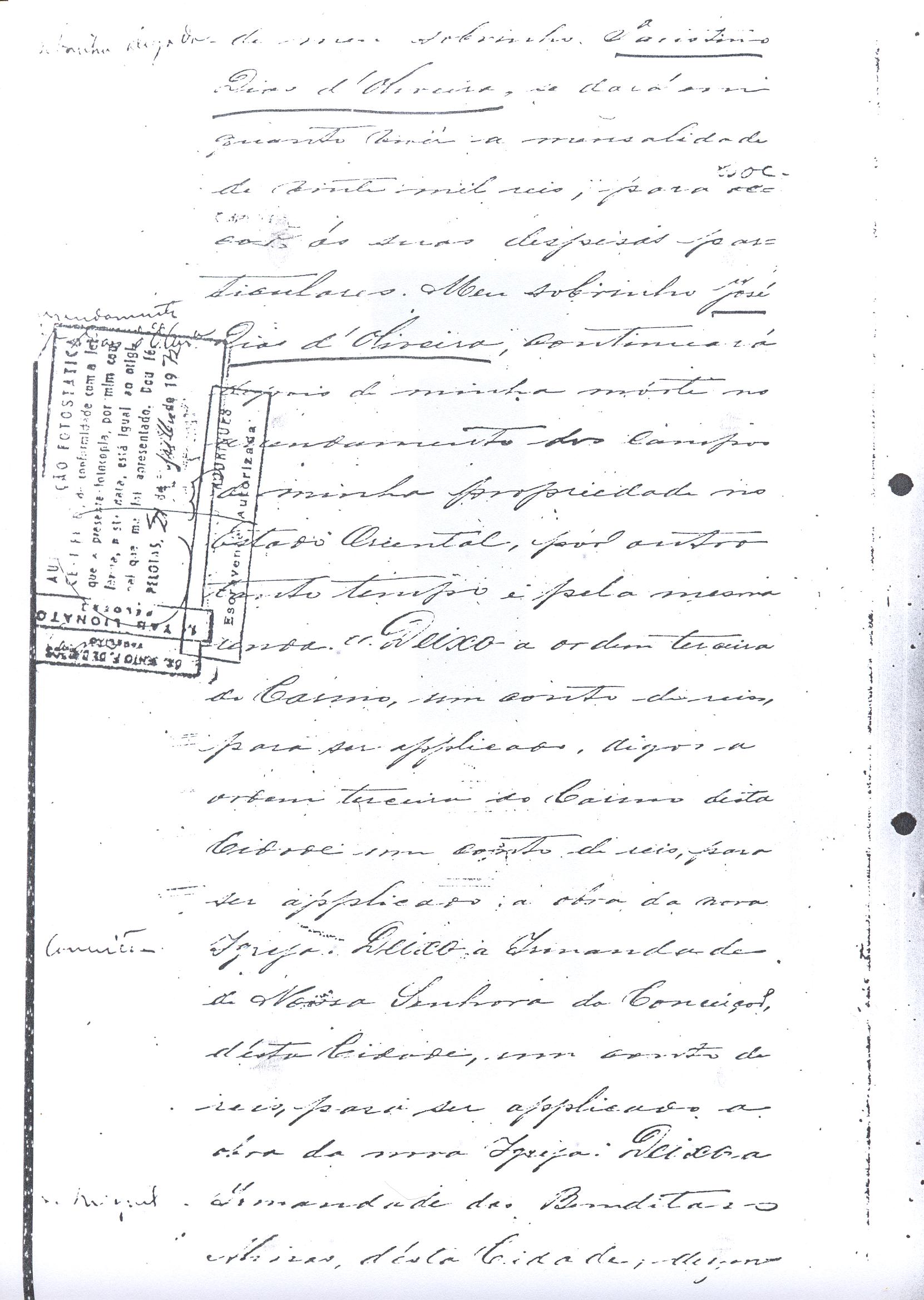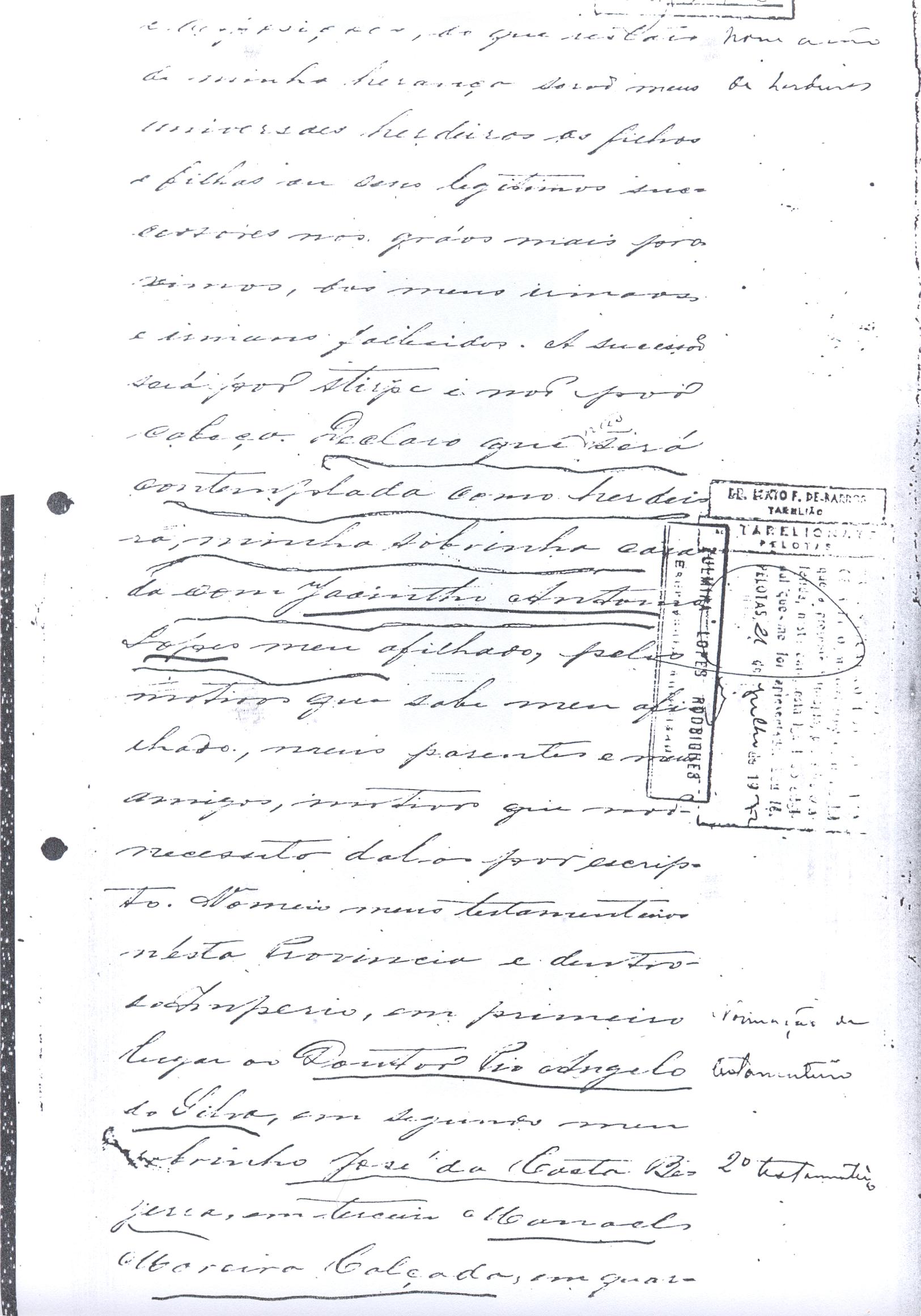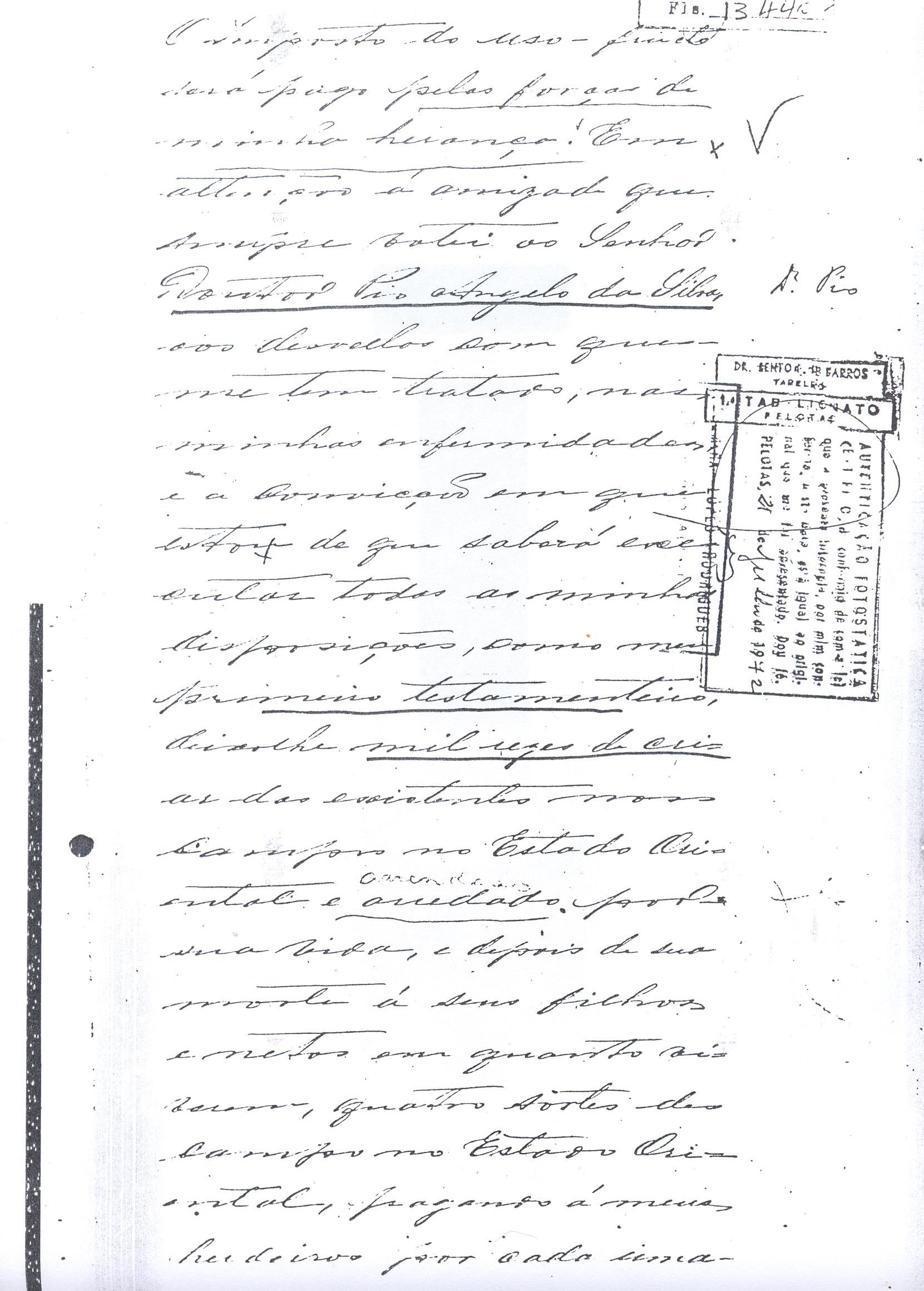 crias, conservar no campo seus animaes. Em memória de meu fallecido compadre Doutor João Batista de Figueredo Mascarenhas e com a attenção e amizade que consagro a sua viuva, minha comadre, Dona Manoela, deixo a dita senhora livre de direito o usufructo de quatrocentas rezes de cria e mais o campo e benfeitorias que pretendo comprar do bacharel Candido Alves Pereira e João Agostinho da Silva no lugar chamado PedraSó, passando o usufructo do gado, campo e benfeitorias a seus filhos e filhas necessitados e por morte destes a propriedade de tudo a seus netos. Se por ventura em minha vida não puder realizar a compra do campo e benfeitorias, como espero, a compra será efectuada por meu testamenteiro pela quantia convencionada de vinte e um contos de réis afirá o direito de transmissão a fim de ter execução esta minha disposição. No caso, porém, de não puder em minha vida realizar a compra do campo e benfeitorias como espero, a compra será effectuada por meu testamenteiro ou herdeiros pela quantia convencionada de vinte e um conto de réis, afóra aos direitos de transmissão, afim de ter execução esta minha disposição. No caso porém de não se effectuar a compra do campo e benfeitorias, por motivos alheios ao meu testamenteiro ou herdeiros, se comprará para minha comadre referida, com as mesmas condições impostas, uma propriedade a sua vontade, e para a sua compra será applicado o valor das quatrocentas rezes do campo e benfeitorias de PedraSó. O dinheiro para cumprimento destas disposições, será tirado dos rendimentos dos meus bens e dos do usufructo que me forem devidos até o dia do meu fallecimento. A minha sobrinha aleijada, filha do meu sobrinho Faustino Dias de Oliveira se dará em quanto viver a mensalidade de vinte mil réis (20$000) para socorrer as suas despesas particulares. Meu sobrinho José Dias de Oliveira continuará depois de minha morte no arrendamento dos campos de minha propriedade no Estado Oriental por outro tanto tempo e pela mesma renda. DEIXO a ordem terceira (3ª) do Carmo, um conto de réis (1:000$000) , para ser aplicado na obra da nova Igreja. DEIXO a Irmandade da Nossa Senhora da Conceição, desta Cidade, um conto de réis (1:000$000) para ser aplicado a obra da sua nova Igreja. DEIXO a Irmandade das Benditas Almas, desta Cidade, duzentos mil réis (200$000), para melhoramentos no seu altar; seiscentos mil réis (600$000) para mandar dizer missa por alma de meus Pais, dos meus irmãos e irmãs e mais quatrocentos mil réis, (400$000) para missas por alma de meus escravos fallecidos. Se não tiver meus sobrinho Jose da Costa Bezerra prestado contas, em minha vida, da administração dos meus dinheiros a seu cargo, qualquer que for o saldo a meu favor que mostrem meus assentos e documentos, não lhe será exigido e nem será coagido á prestação de contas, pois não quero que se ponha em dúvida seu crédito, em rasão da grande confiança que nelle deposito. Se eu fallecer nesta Cidade, o meu enterro se fará sem ostentação alguma prescindindo-se mesmo de quaisquer honras, que me sejam devidos. O meu corpo será conduzido à mão em o caixão mais simples possível, por amigos meus que a isso se queirão prestar até o cemitério, se comparecerem pobres em número sufficiente, serão os preferidos, dando o meu testamenteiro ocultamente a cada uma esmola igual a que, para identico fim, em seu testamento deixou minha mulher. Encommendado o corpo na Capella do Carmo de cuja ordem sou antigo irmão, será conduzido à Igreja Matriz, para ahi junto ao altar de Nossa Senhora da Conceição, minha advogada, receber outra encommendação. Satisfeitos todos os meus legados e disposições de que restarão de minha herança serão meus universais herdeiros os filhos e filhas ou seus legitimos sucessores nos gráos mais próximos, dos meus irmaos e irmans fallecidos. A sucessão será por stirp e não por cabeça. Declaro que não será contemplada como herdeira minha sobrinha casada com Jacintho Antonio Lopes, meu afilhado, pelos motivos que sabe meu afiliado, meus parentes, meus amigos. Motivos que não necessito dal-os por escripto. Nomeio meus testamenteiro nesta Provincia e dentro do Império, em primeiro lugar o Doutor Pio Angelo da Silva, em segundo lugar meu sobrinho Jose da Costa Bezerra e em terceiro Manoel Moreira Calçada, em quarto Albino Faustino Corrêa, e no Estado Oriental Don Carlos Regles e a todos tenho por pessoas honestas e abonadas, e confio aceitarem a execução de minhas ulteriores disposições. Marco-lhes o praso de dez annos para a prestação de contas. Declaro que não devo quantia alguma porém, se algumas diminutas apparecerem meu testamenteiro pagará logo, independentemente de qualquer formalidade judiciária. Este meu testamento que em duplicata mandei escrever pelo Bacharel Cândido Alves Pereira foi-me por elle lido e achando-o conforme o que havia disposto assigno, rogando as Justiças do Império e as do Estado Oriental, que o fação cumprir como nelle se contém, ainda que lhe falte alguma clausula ou clausulas que as hei por expressadas e declaradas como se dellas ou de cada uma fizesse especial menção e por elle revogo qualquer disposição em testamento ulterior. Rio Grande em nove de junho de mil oitocentos e setenta e tres. Declaro que meu compadre Calçada em lugar de tres contos de réis será de dous contos dos arrendamento nos vinte e cinco anos. Declaro que os campos arrendados a meu sobrinho Jose Dias de Oliveira são nessa Provincia, no Moreira, Salso e Canudos, Municipio desta Cidade e não no Estado Oriental. Domingos Faustino Corrêa. Approvação – Ano do Nascimento do Nosso Senhor Jesus Cristho de mil oitocentos e setenta e tres, aos onze de junho, nesta cidade do Rio Grande em casa de morada do Comendador Domingos Faustino Corrêa aonde eu Tabelião bem e sendo ahi compareceu o mesmo Commendador, bem conhecido de mim Tabelião e das cinco testemunhas abaixo assinadas, bem com