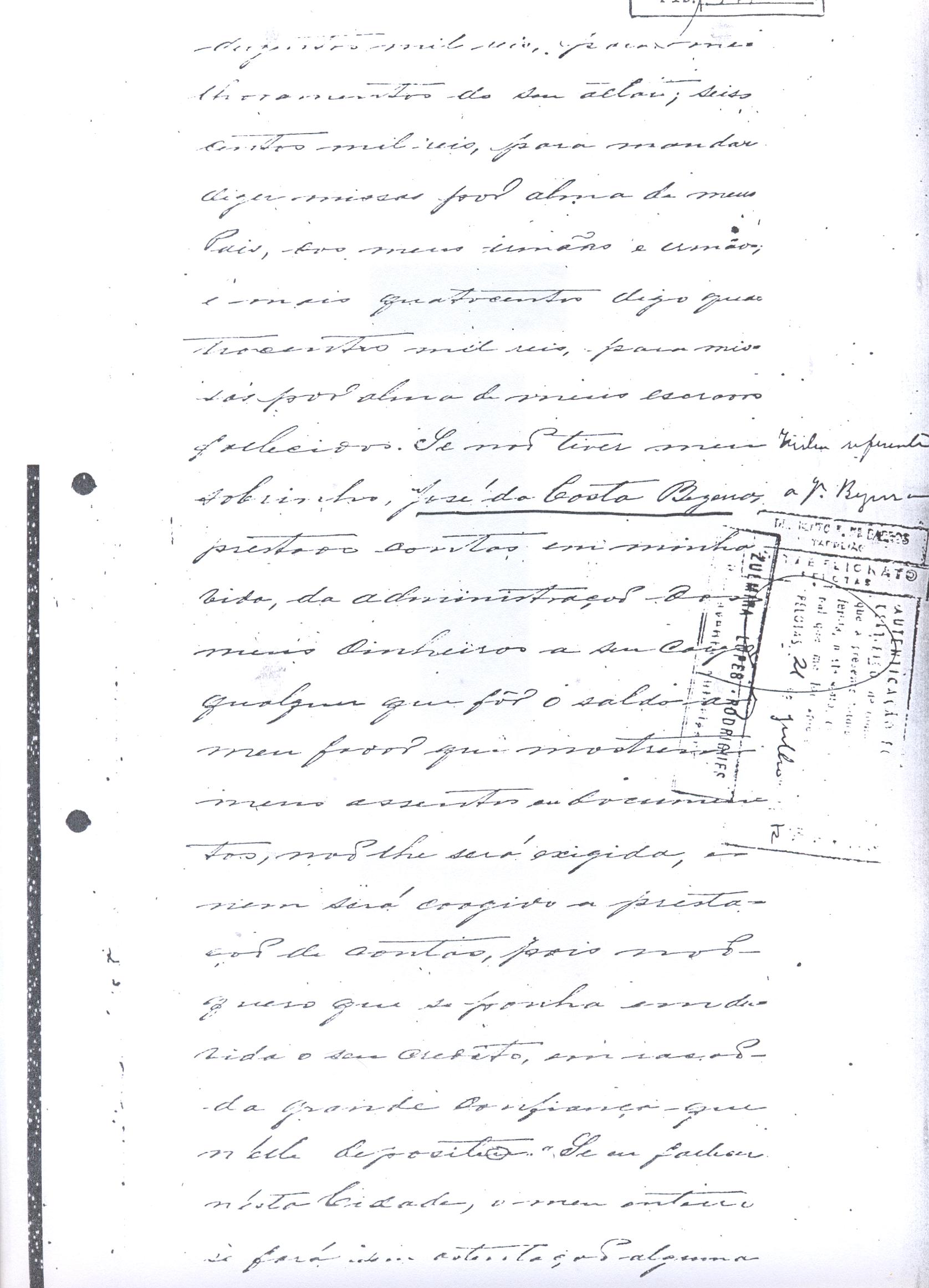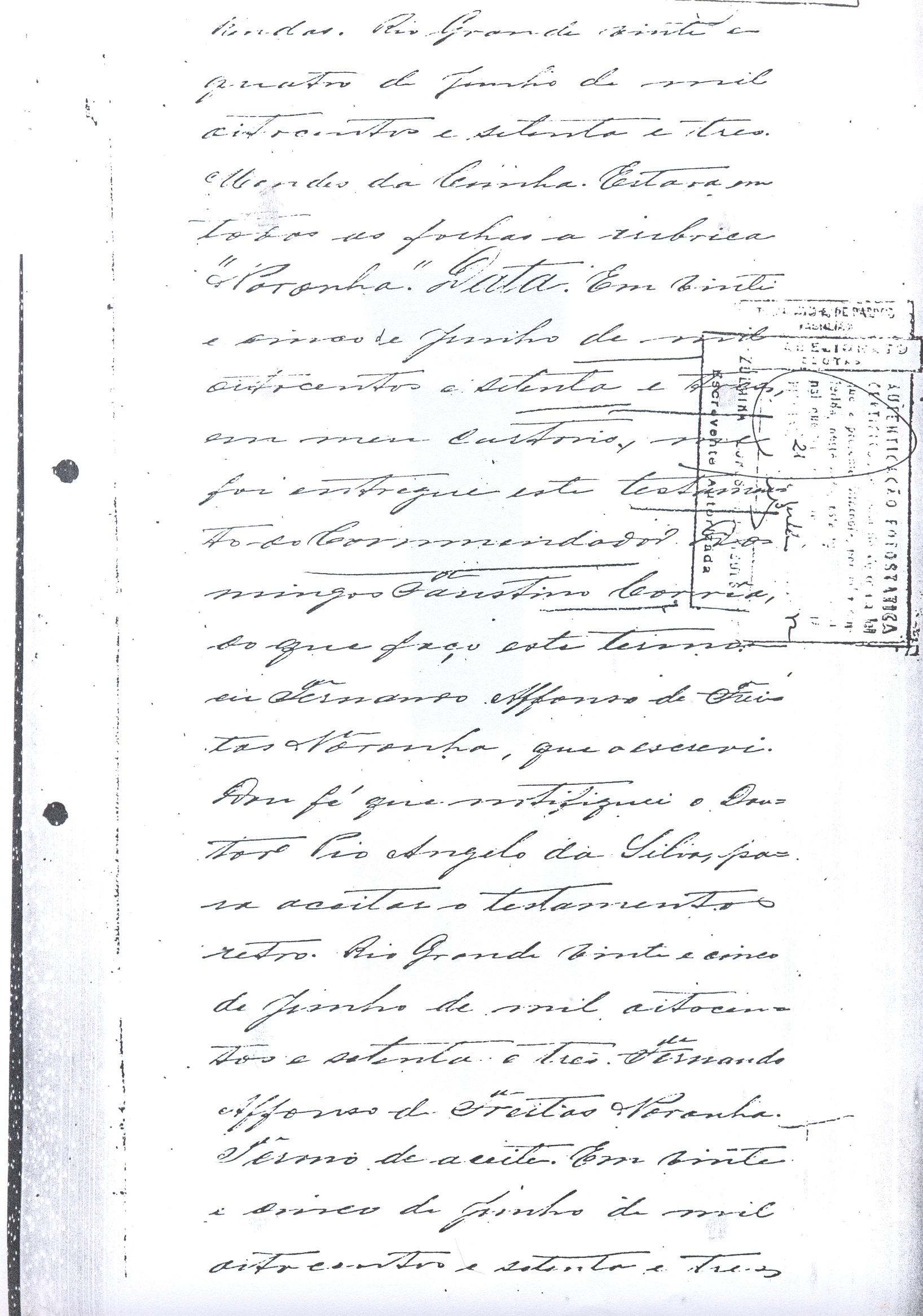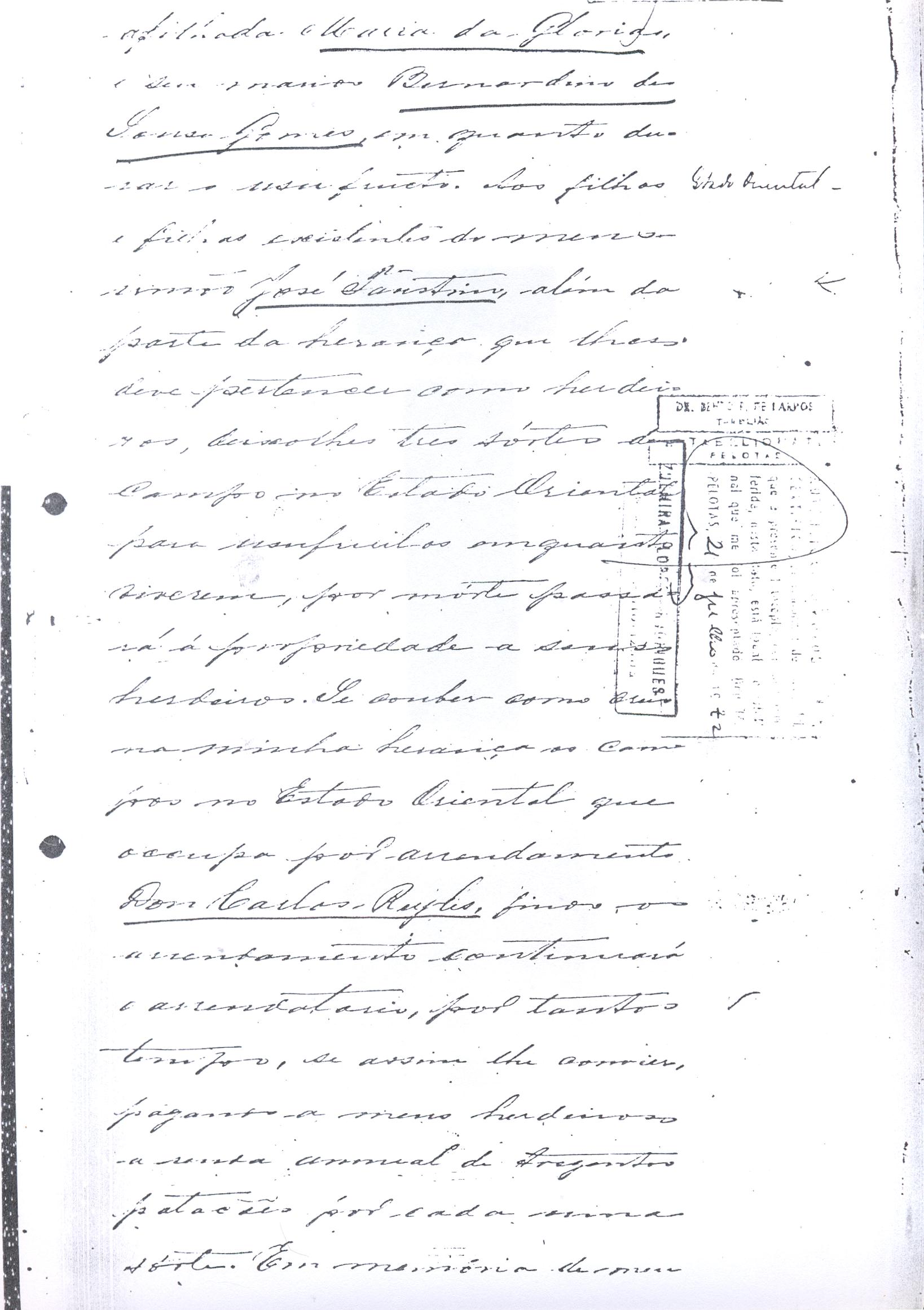 crias, conservar no campo seus animaes. Em memória de meu fallecido compadre Doutor João Batista de Figueredo Mascarenhas e com a attenção e amizade que consagro a sua viuva, minha comadre, Dona Manoela, deixo a dita senhora livre de direito o usufructo de quatrocentas rezes de cria e mais o campo e benfeitorias que pretendo comprar do bacharel Candido Alves Pereira e João Agostinho da Silva no lugar chamado PedraSó, passando o usufructo do gado, campo e benfeitorias a seus filhos e filhas necessitados e por morte destes a propriedade de tudo a seus netos. Se por ventura em minha vida não puder realizar a compra do campo e benfeitorias, como espero, a compra será efectuada por meu testamenteiro pela quantia convencionada de vinte e um contos de réis afirá o direito de transmissão a fim de ter execução esta minha disposição. No caso, porém, de não puder em minha vida realizar a compra do campo e benfeitorias como espero, a compra será effectuada por meu testamenteiro ou herdeiros pela quantia convencionada de vinte e um conto de réis, afóra aos direitos de transmissão, afim de ter execução esta minha disposição. No caso porém de não se effectuar a compra do campo e benfeitorias, por motivos alheios ao meu testamenteiro ou herdeiros, se comprará para minha comadre referida, com as mesmas condições impostas, uma propriedade a sua vontade, e para a sua compra será applicado o valor das quatrocentas rezes do campo e benfeitorias de PedraSó. O dinheiro para cumprimento destas disposições, será tirado dos rendimentos dos meus bens e dos do usufructo que me forem devidos até o dia do meu fallecimento. A minha sobrinha aleijada, filha do meu sobrinho Faustino Dias de Oliveira se dará em quanto viver a mensalidade de vinte mil réis (20$000) para socorrer as suas despesas particulares. Meu sobrinho José Dias de Oliveira continuará depois de minha morte no arrendamento dos campos de minha propriedade no Estado Oriental por outro tanto tempo e pela mesma renda. DEIXO a ordem terceira (3ª) do Carmo, um conto de réis (1:000$000) , para ser aplicado na obra da nova Igreja. DEIXO a Irmandade da Nossa Senhora da Conceição, desta Cidade, um conto de réis (1:000$000) para ser aplicado a obra da sua nova Igreja. DEIXO a Irmandade das Benditas Almas, desta Cidade, duzentos mil réis (200$000), para melhoramentos no seu altar; seiscentos mil réis (600$000) para mandar dizer missa por alma de meus Pais, dos meus irmãos e irmãs e mais quatrocentos mil réis, (400$000) para missas por alma de meus escravos fallecidos. Se não tiver meus sobrinho Jose da Costa Bezerra prestado contas, em minha vida, da administração dos meus dinheiros a seu cargo, qualquer que for o saldo a meu favor que mostrem meus assentos e documentos, não lhe será exigido e nem será coagido á prestação de contas, pois não quero que se ponha em dúvida seu crédito, em rasão da grande confiança que nelle deposito. Se eu fallecer nesta Cidade, o meu enterro se fará sem ostentação alguma prescindindo-se mesmo de quaisquer honras, que me sejam devidos. O meu corpo será conduzido à mão em o caixão mais simples possível, por amigos meus que a isso se queirão prestar até o cemitério, se comparecerem pobres em número sufficiente, serão os preferidos, dando o meu testamenteiro ocultamente a cada uma esmola igual a que, para identico fim, em seu testamento deixou minha mulher. Encommendado o corpo na Capella do Carmo de cuja ordem sou antigo irmão, será conduzido à Igreja Matriz, para ahi junto ao altar de Nossa Senhora da Conceição, minha advogada, receber outra encommendação. Satisfeitos todos os meus legados e disposições de que restarão de minha herança serão meus universais herdeiros os filhos e filhas ou seus legitimos sucessores nos gráos mais próximos, dos meus irmaos e irmans fallecidos. A sucessão será por stirp e não por cabeça. Declaro que não será contemplada como herdeira minha sobrinha casada com Jacintho Antonio Lopes, meu afilhado, pelos motivos que sabe meu afiliado, meus parentes, meus amigos. Motivos que não necessito dal-os por escripto. Nomeio meus testamenteiro nesta Provincia e dentro do Império, em primeiro lugar o Doutor Pio Angelo da Silva, em segundo lugar meu sobrinho Jose da Costa Bezerra e em terceiro Manoel Moreira Calçada, em quarto Albino Faustino Corrêa, e no Estado Oriental Don Carlos Regles e a todos tenho por pessoas honestas e abonadas, e confio aceitarem a execução de minhas ulteriores disposições. Marco-lhes o praso de dez annos para a prestação de contas. Declaro que não devo quantia alguma porém, se algumas diminutas apparecerem meu testamenteiro pagará logo, independentemente de qualquer formalidade judiciária. Este meu testamento que em duplicata mandei escrever pelo Bacharel Cândido Alves Pereira foi-me por elle lido e achando-o conforme o que havia disposto assigno, rogando as Justiças do Império e as do Estado Oriental, que o fação cumprir como nelle se contém, ainda que lhe falte alguma clausula ou clausulas que as hei por expressadas e declaradas como se dellas ou de cada uma fizesse especial menção e por elle revogo qualquer disposição em testamento ulterior. Rio Grande em nove de junho de mil oitocentos e setenta e tres. Declaro que meu compadre Calçada em lugar de tres contos de réis será de dous contos dos arrendamento nos vinte e cinco anos. Declaro que os campos arrendados a meu sobrinho Jose Dias de Oliveira são nessa Provincia, no Moreira, Salso e Canudos, Municipio desta Cidade e não no Estado Oriental. Domingos Faustino Corrêa. Approvação – Ano do Nascimento do Nosso Senhor Jesus Cristho de mil oitocentos e setenta e tres, aos onze de junho, nesta cidade do Rio Grande em casa de morada do Comendador Domingos Faustino Corrêa aonde eu Tabelião bem e sendo ahi compareceu o mesmo Commendador, bem conhecido de mim Tabelião e das cinco testemunhas abaixo assinadas, bem com