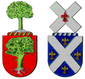 I - um escudo em campo de prata, com 3 faixas de vermelho. Timbre: um urso de negro, armado de vermelho, sainte de uma capela de silvas de verde, preluzida de prata;